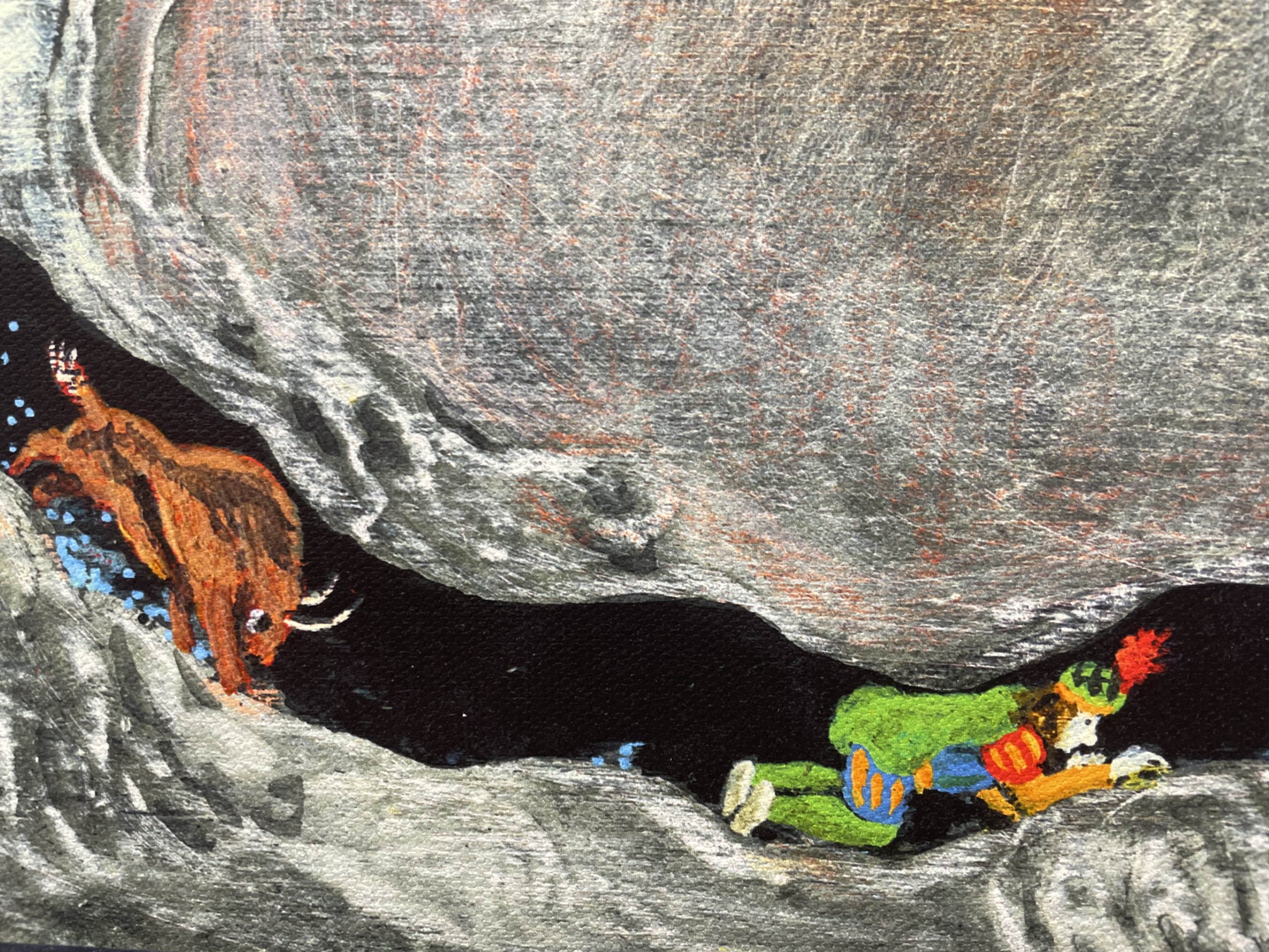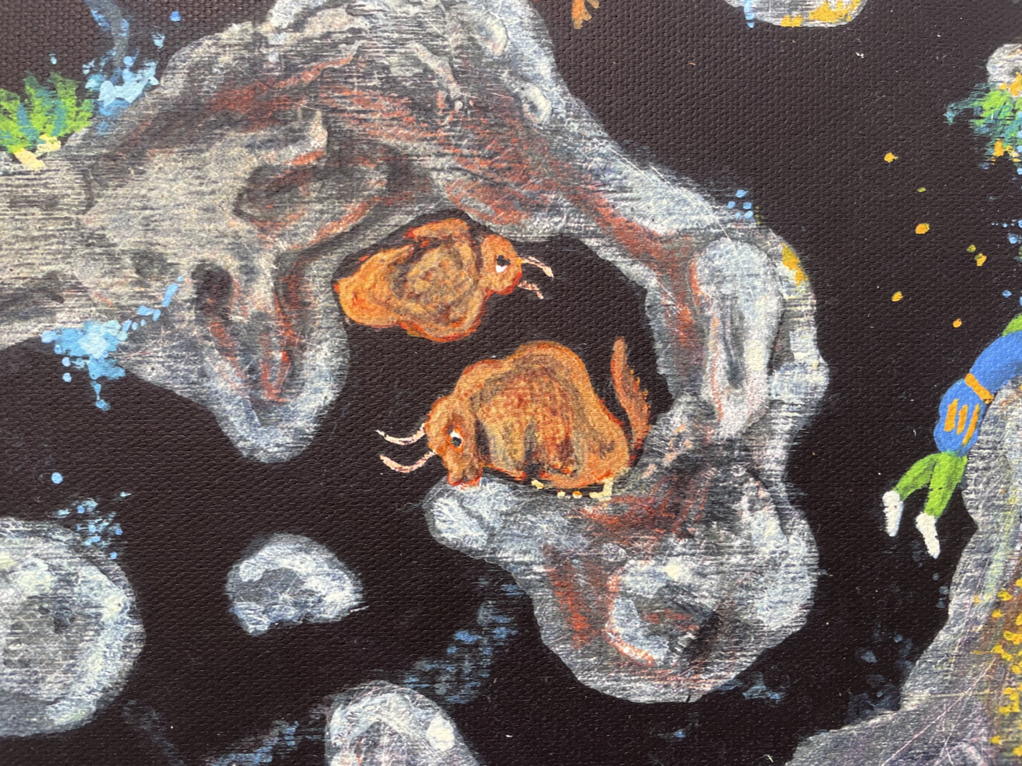 他在具有溫和質地的木板上作畫,結合水彩、壓克力顏料、蠟筆、鉛筆、墨水等各種繪畫媒材,複合媒材的創作手法同時也呈現了其觀察世界的方式,作畫的配置如同幼年時在花園中玩布偶,觀察每個角色擁有哪些特點,將其移動擺弄,並且讓它們延伸出各自的故事,希望能將此特點同樣展現於他的書中。