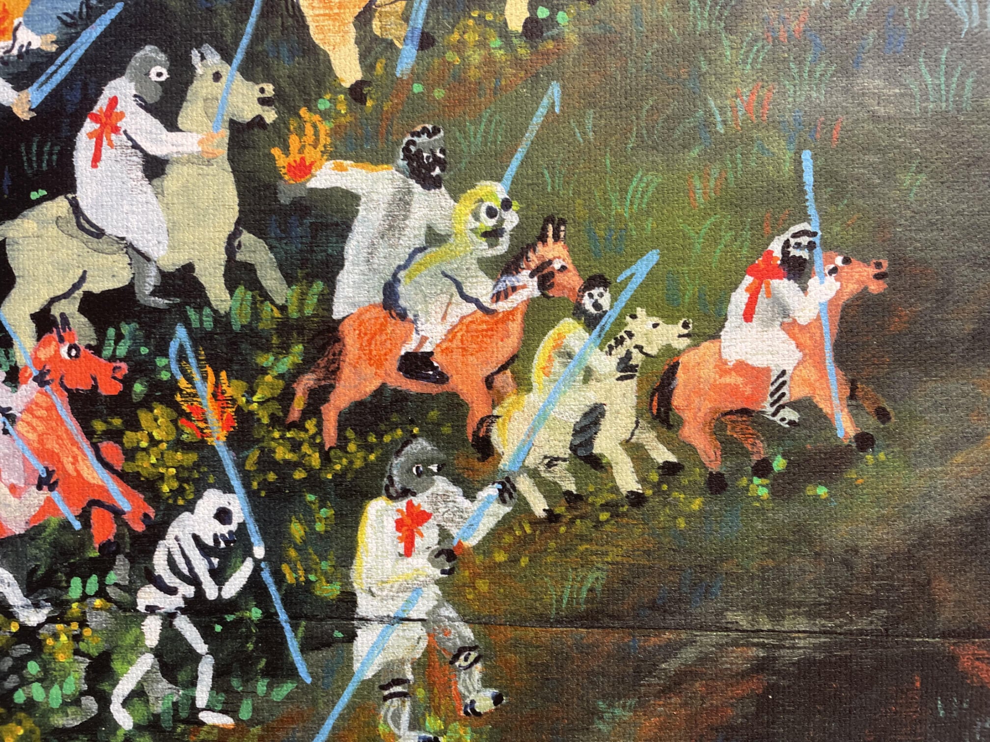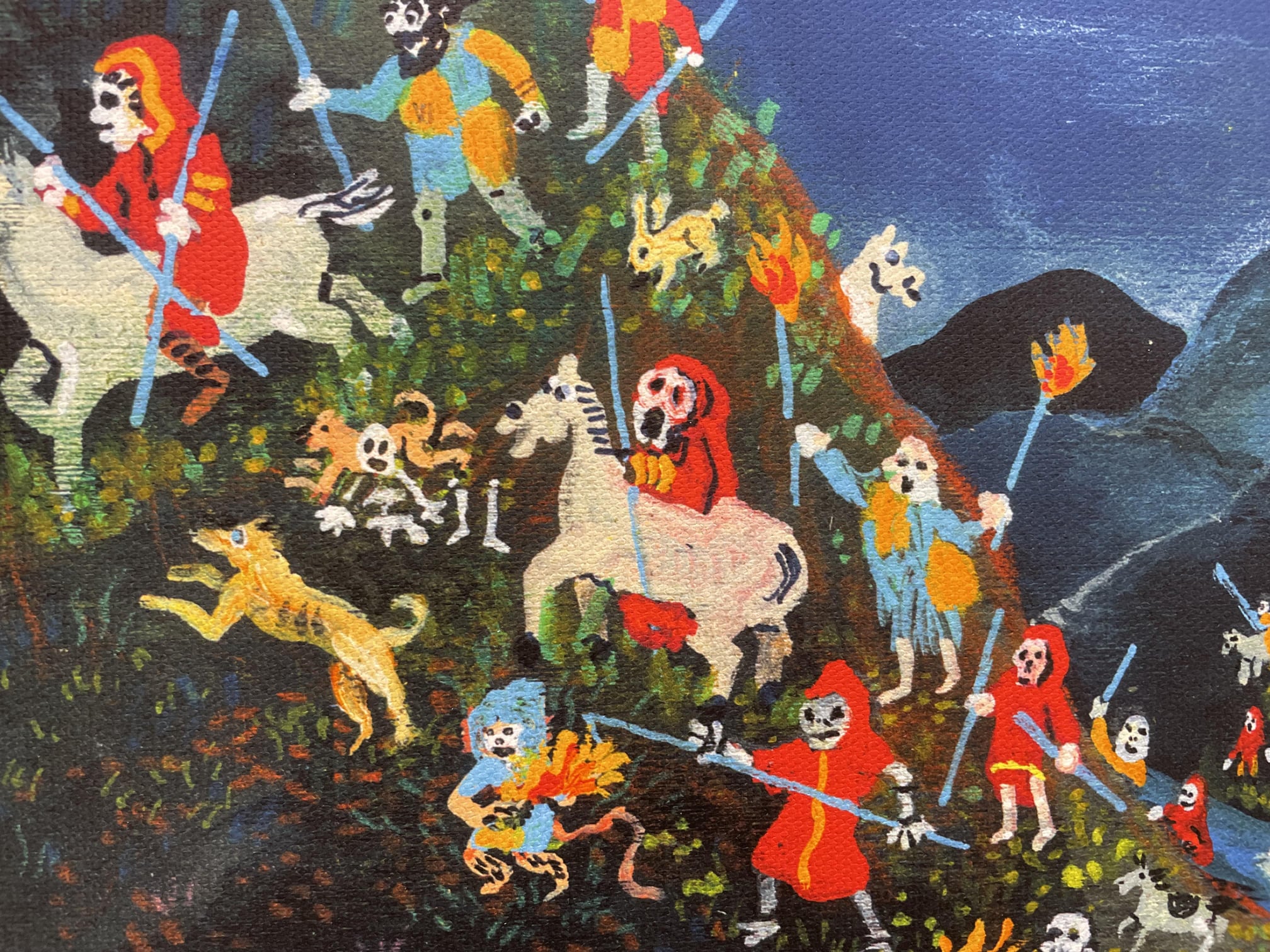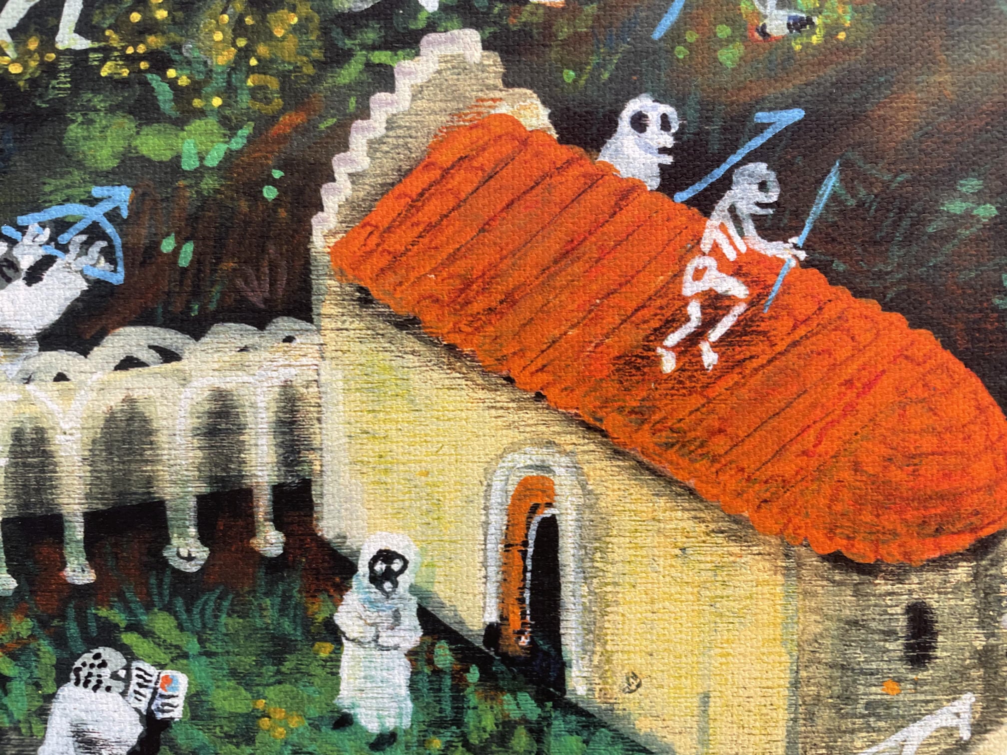 另外包含通俗文化的元素,像是:西班牙紙牌人像、青蛙遊戲,和節慶遊行中的巨人和大頭紙糊人偶。