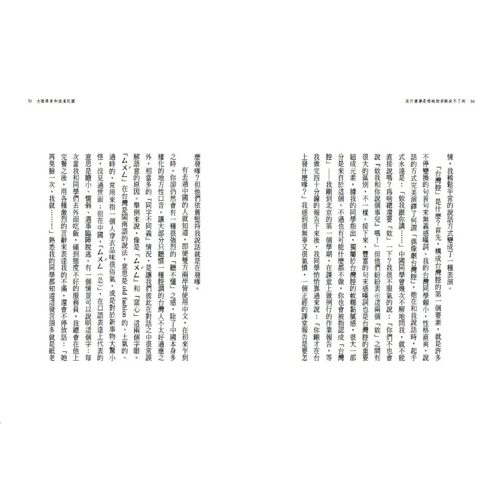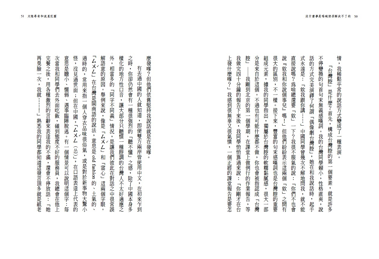 「北京來的」研究生?或是「台灣姑娘」?得到的會是兩種不一樣的對待眼光和互動模式,那麼,我究竟是誰?作者藉人類學的研究面向,透過語言、飲食、時間、移動、家鄉以及差異,觀察田野上的自己以及遭逢的種種窘境、衝突,不僅印證、反思所學,更是一次拋開書本、知識之外的壯遊。