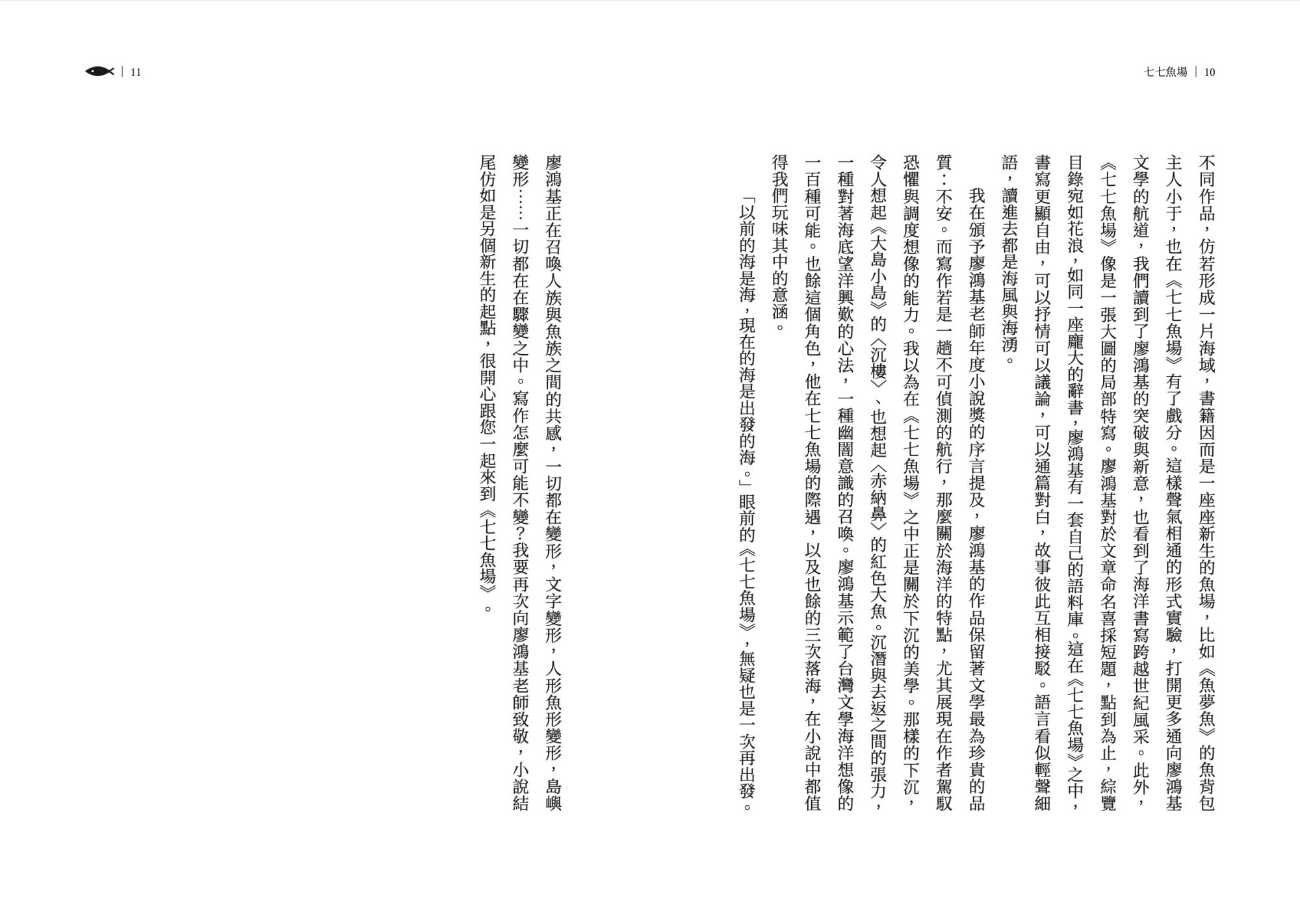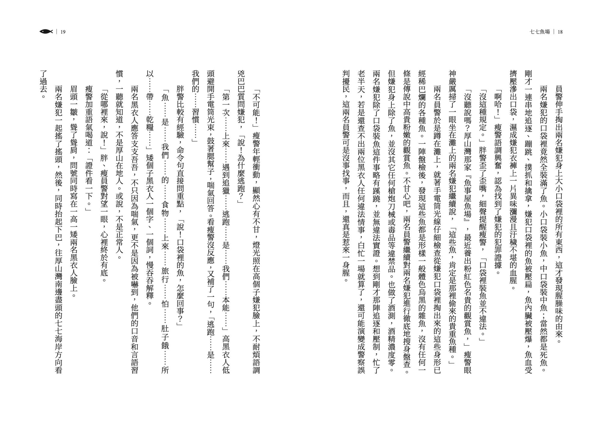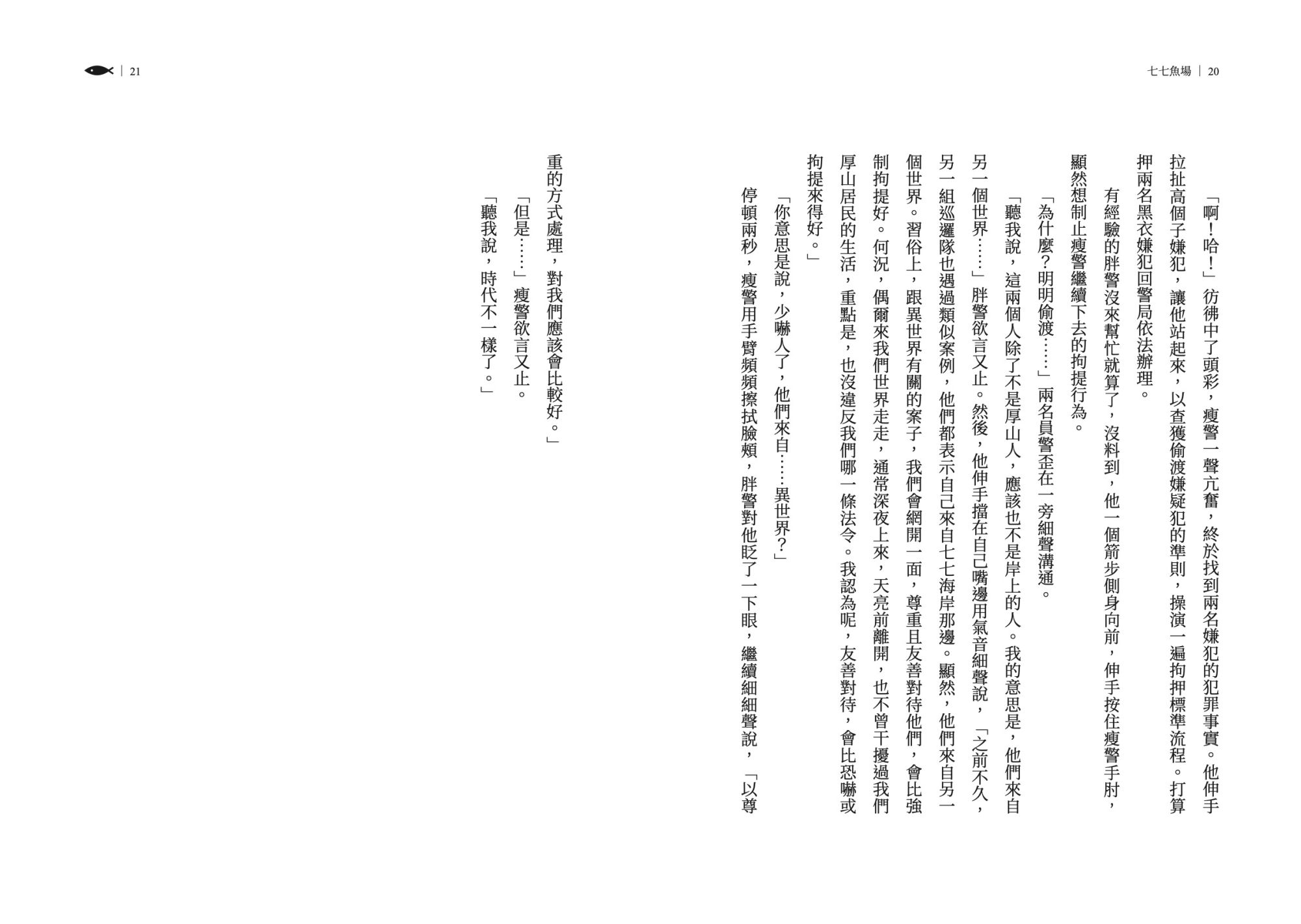 在《七七魚場》之中,書寫更顯自由,可以抒情可以議論,可以通篇對白,故事彼此互相接駁。語言看似輕聲細語,讀進去都是海風與海湧。