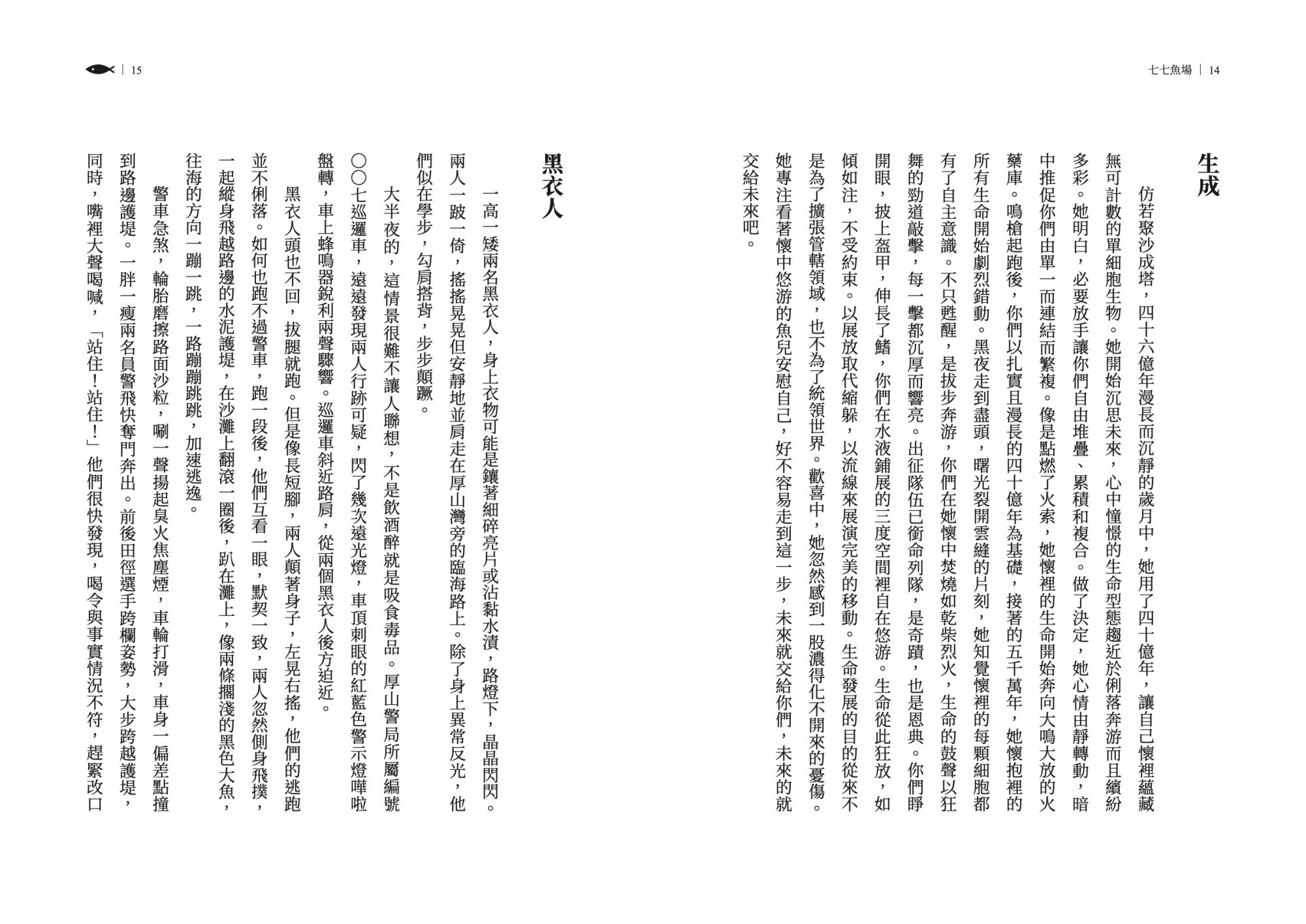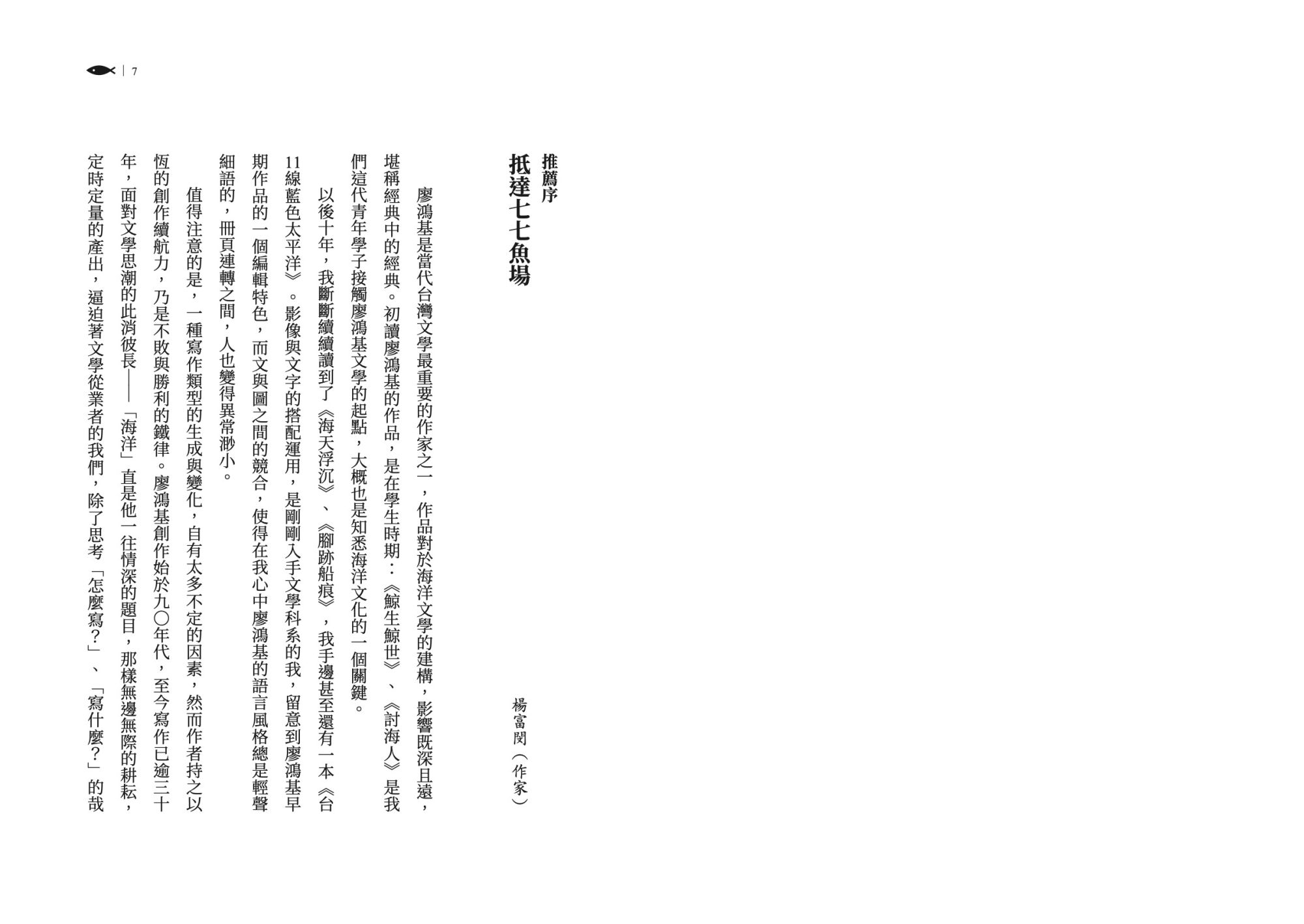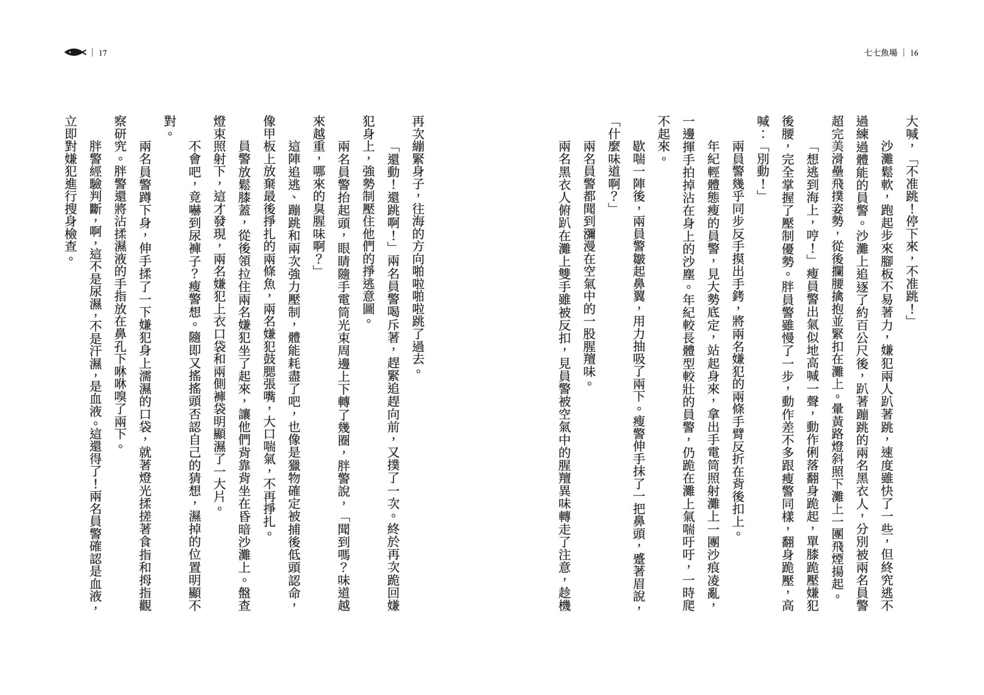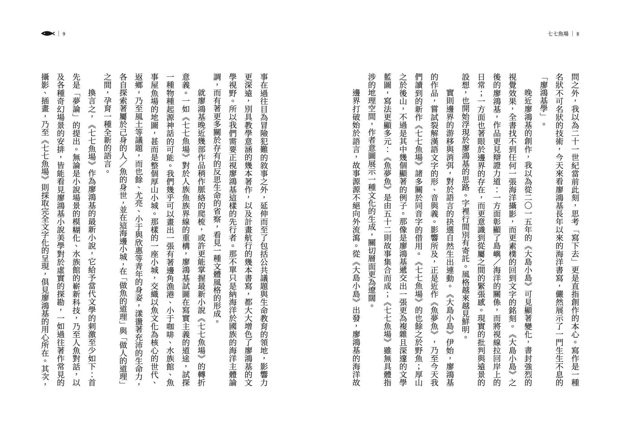 在《七七魚場》之中,書寫更顯自由,可以抒情可以議論,可以通篇對白,故事彼此互相接駁。語言看似輕聲細語,讀進去都是海風與海湧。