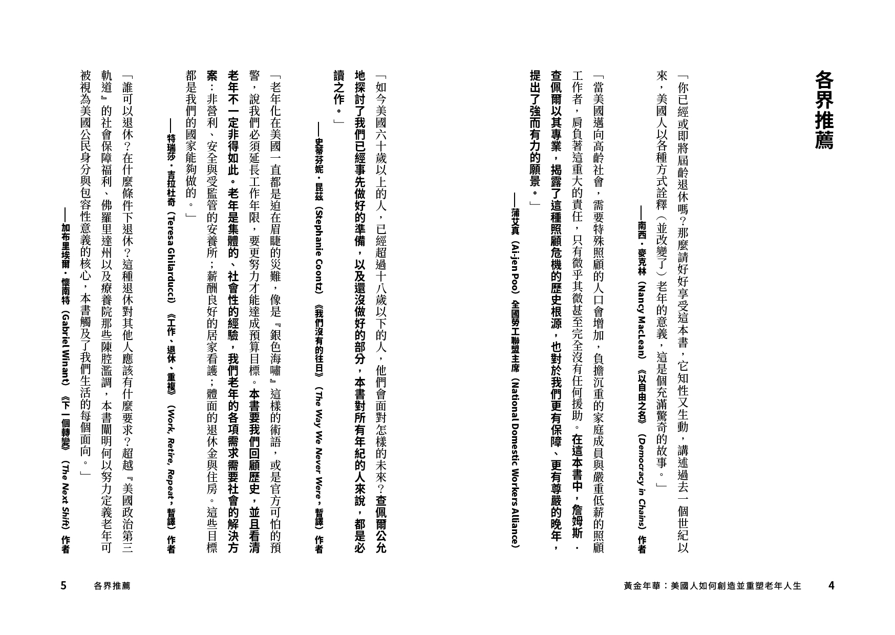 「老年化在美國一直都是迫在眉睫的災難,像是『銀色海嘯』這樣的術語,或是官方可怕的預警,說我們必須延長工作年限,要更努力才能達成預算目標。本書要我們回顧歷史,並且看清老年不一定非得如此。老年是集體的、社會性的經驗,我們老年的各項需求需要社會的解決方案:非營利、安全與受監管的安養所;薪酬良好的居家看護;體面的退休金與住房。這些目標都是我們的國家能夠做的。」——特瑞莎.吉拉杜奇(Teresa Ghilarducci),《工作、退休、重複》(Work, Retire, Repeat)