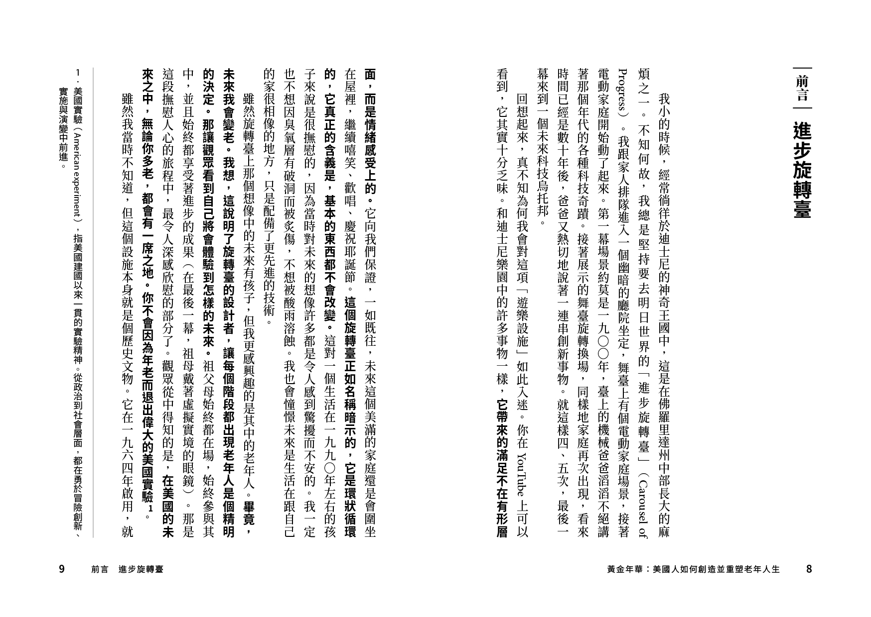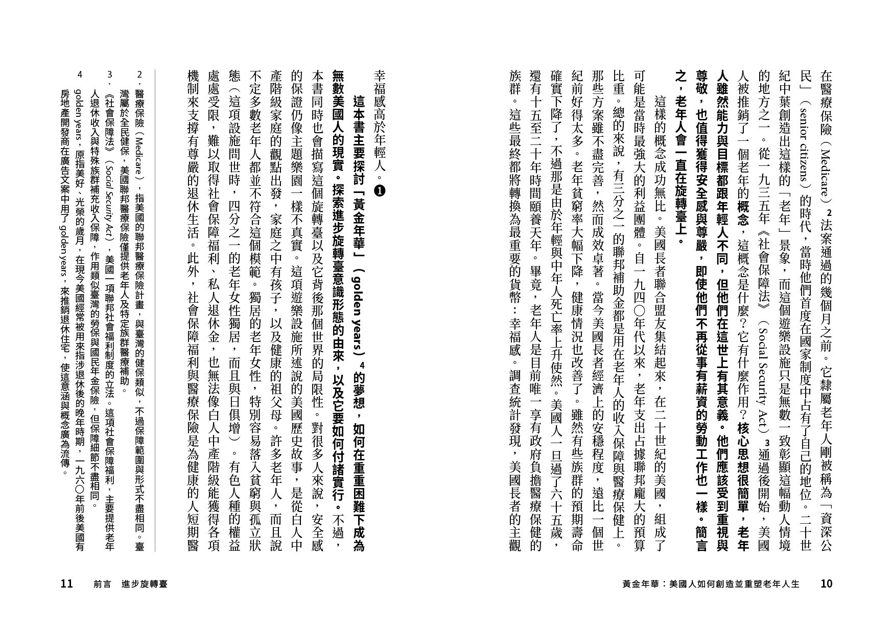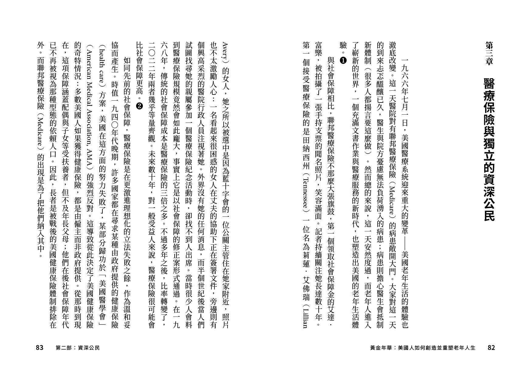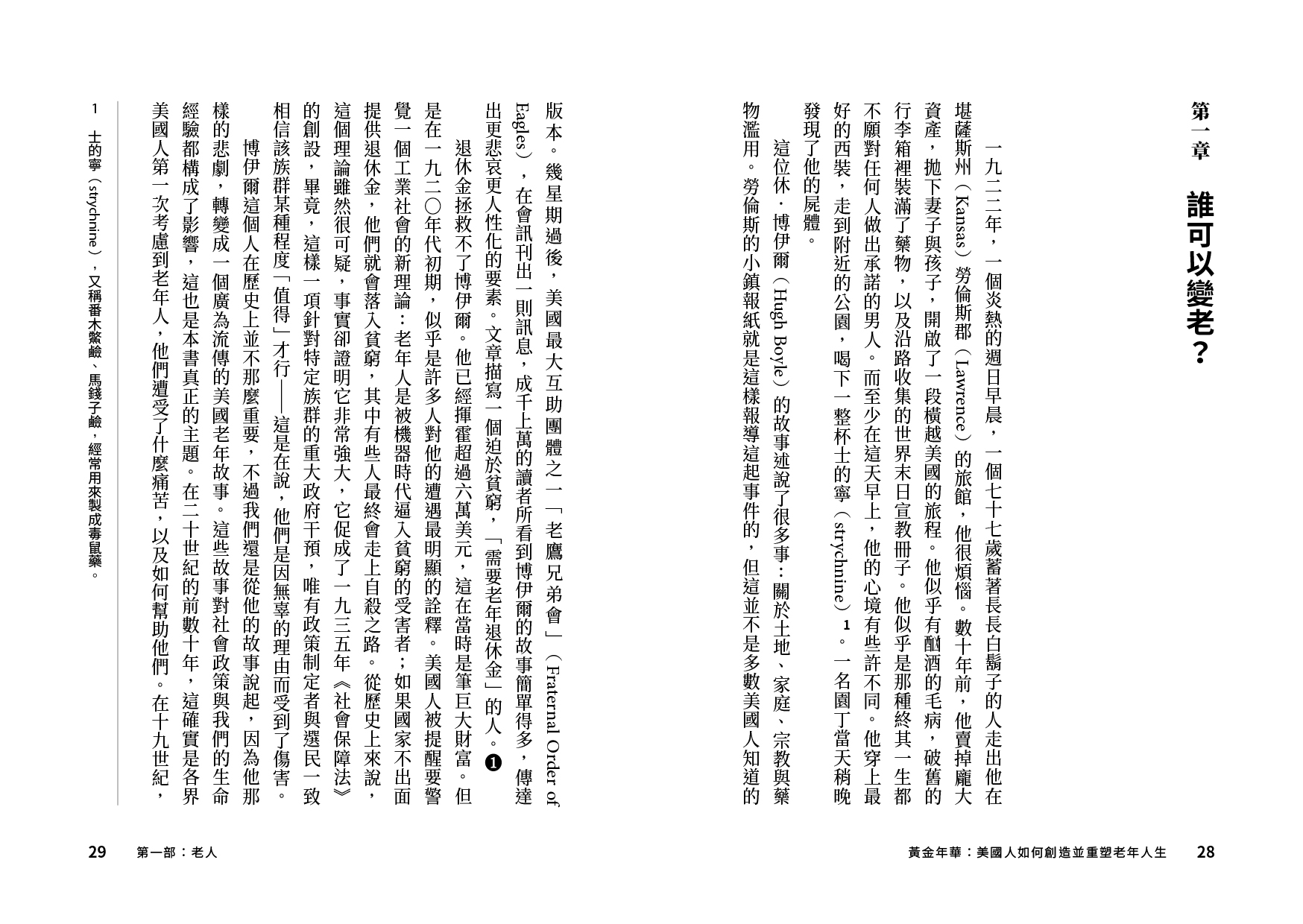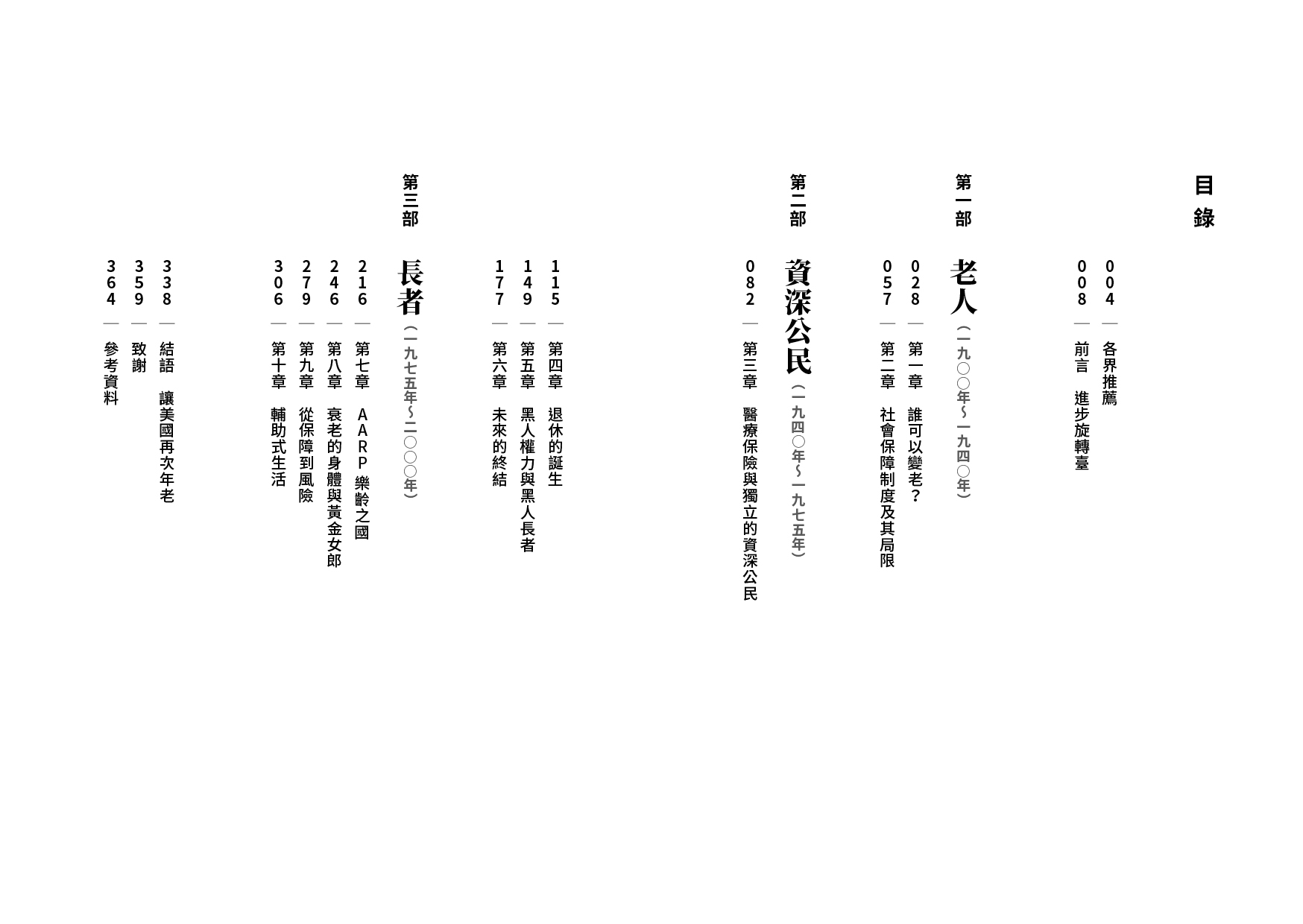 本書分為三大部:「年長者」(1900~1940)、「資深公民」(1940~1975)、「老人」(1975~2000),以此三大部分,來看美國各階段的銀髮族稱謂、政策發展與限制、民間團體的訴求,以及實際退休生活的改變。