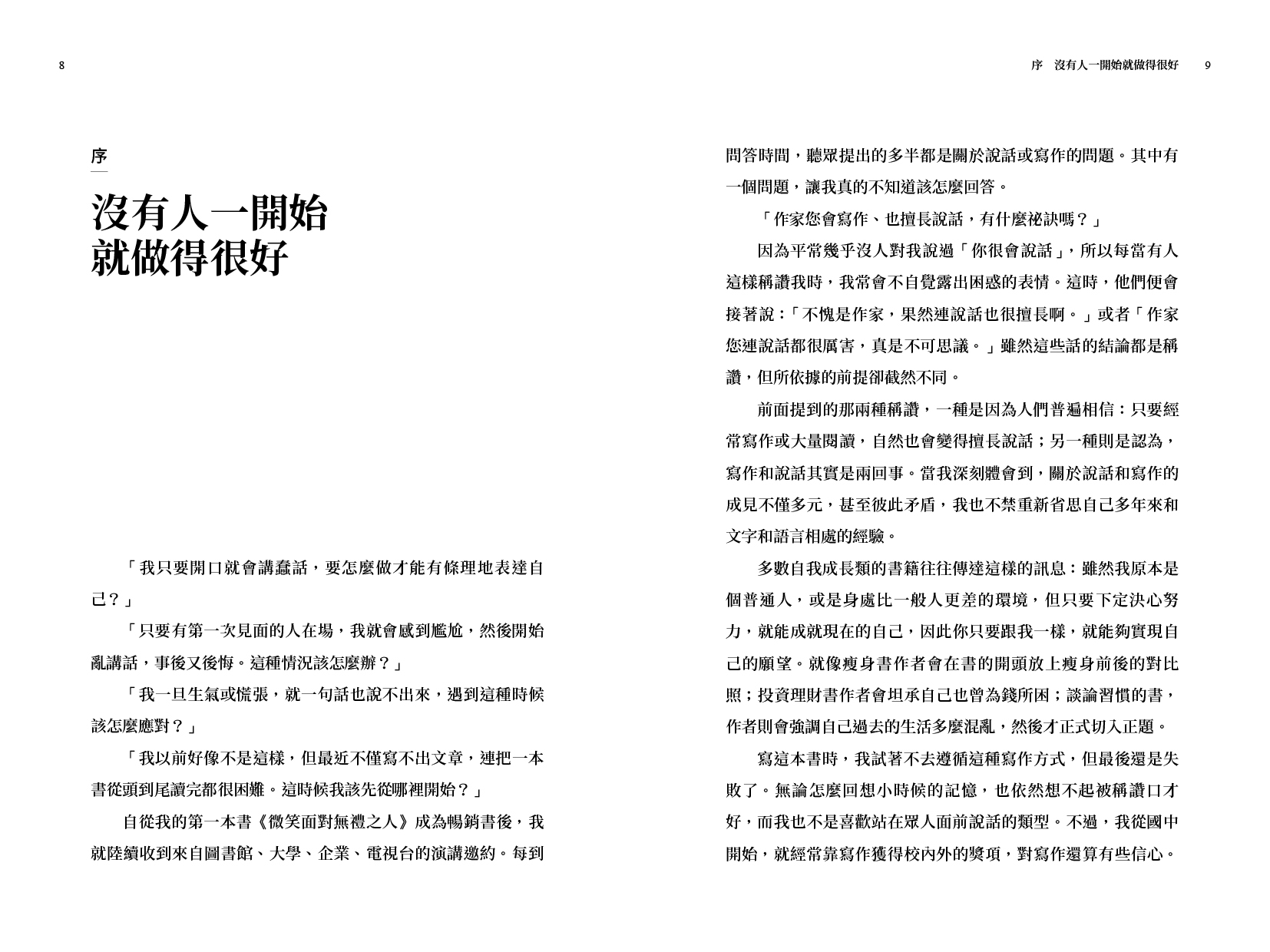 前面提到的那兩種稱讚,其中一部分,是因為人們普遍相信:只要經常寫作或大量閱讀,自然也會變得擅長說話;另一部分,則許多人的經驗告訴他們:寫作和說話其實是兩回事。當我深刻體會到,關於說話和寫作的成見不僅多樣,甚至彼此矛盾,我也不禁重新省思自己多年來和文字、語言相處的經驗。