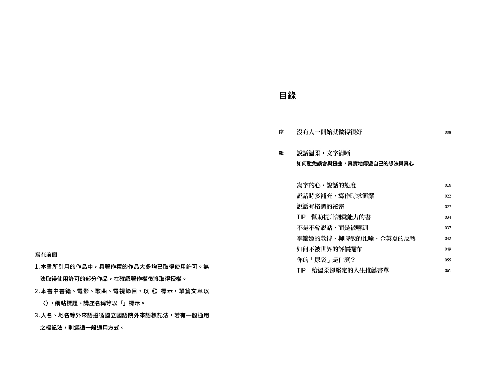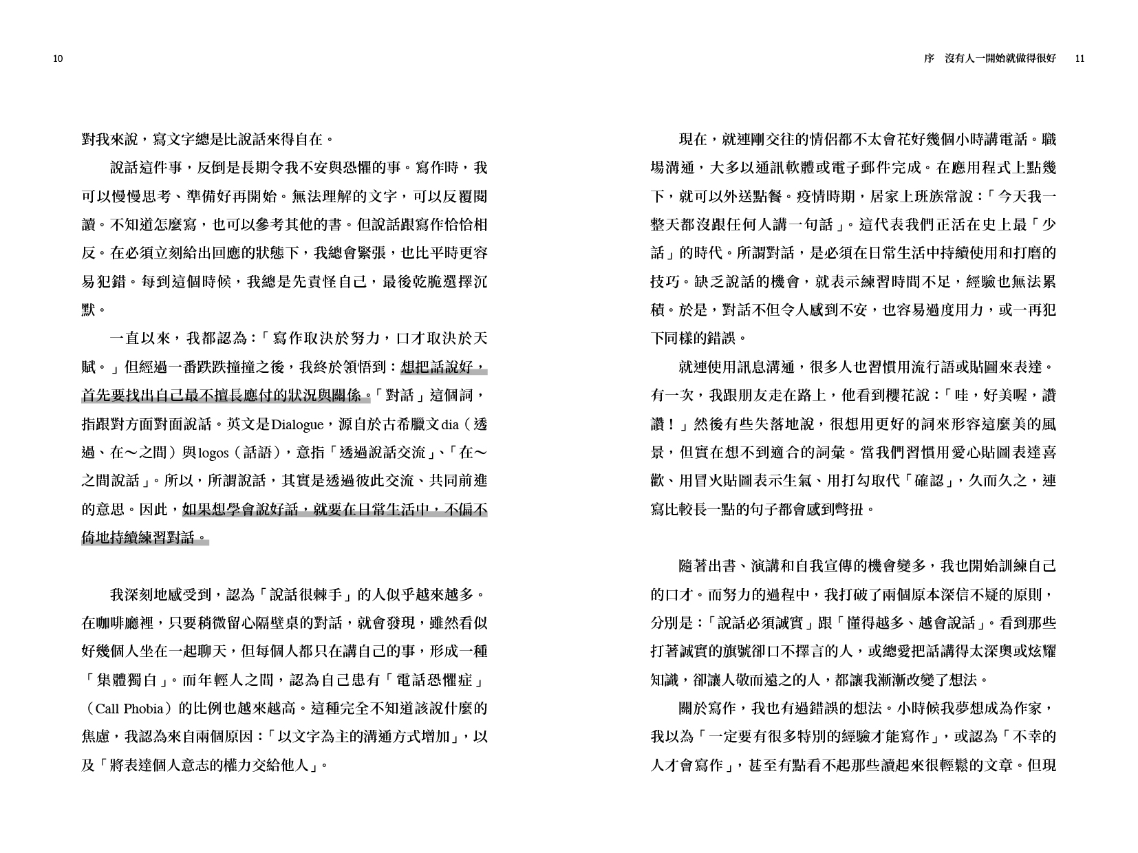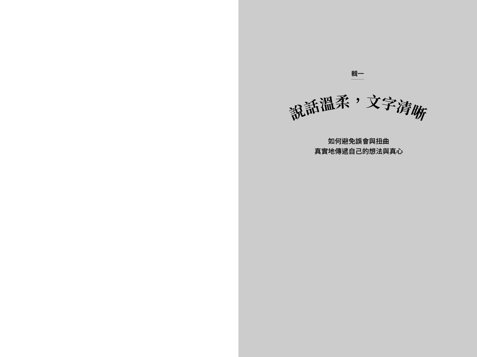 隨著越來越多人難以把話說好,也不擅長寫作和閱讀,能透過語言跟文字表達自我的人,未來將更有競爭力。如果你想把話說清楚,卻總是不小心說得太尖銳;如果你希望自己說話親切,卻總是無法把訊息傳達得明確;如果你覺得自己在說話跟寫作方面實在羞於見人,那我希望跟你分享一些我從經驗中得到的領悟。