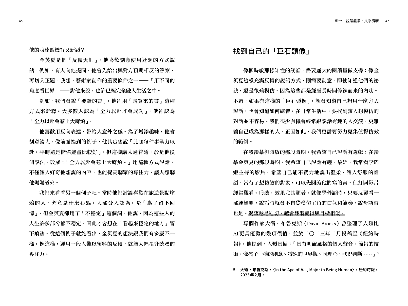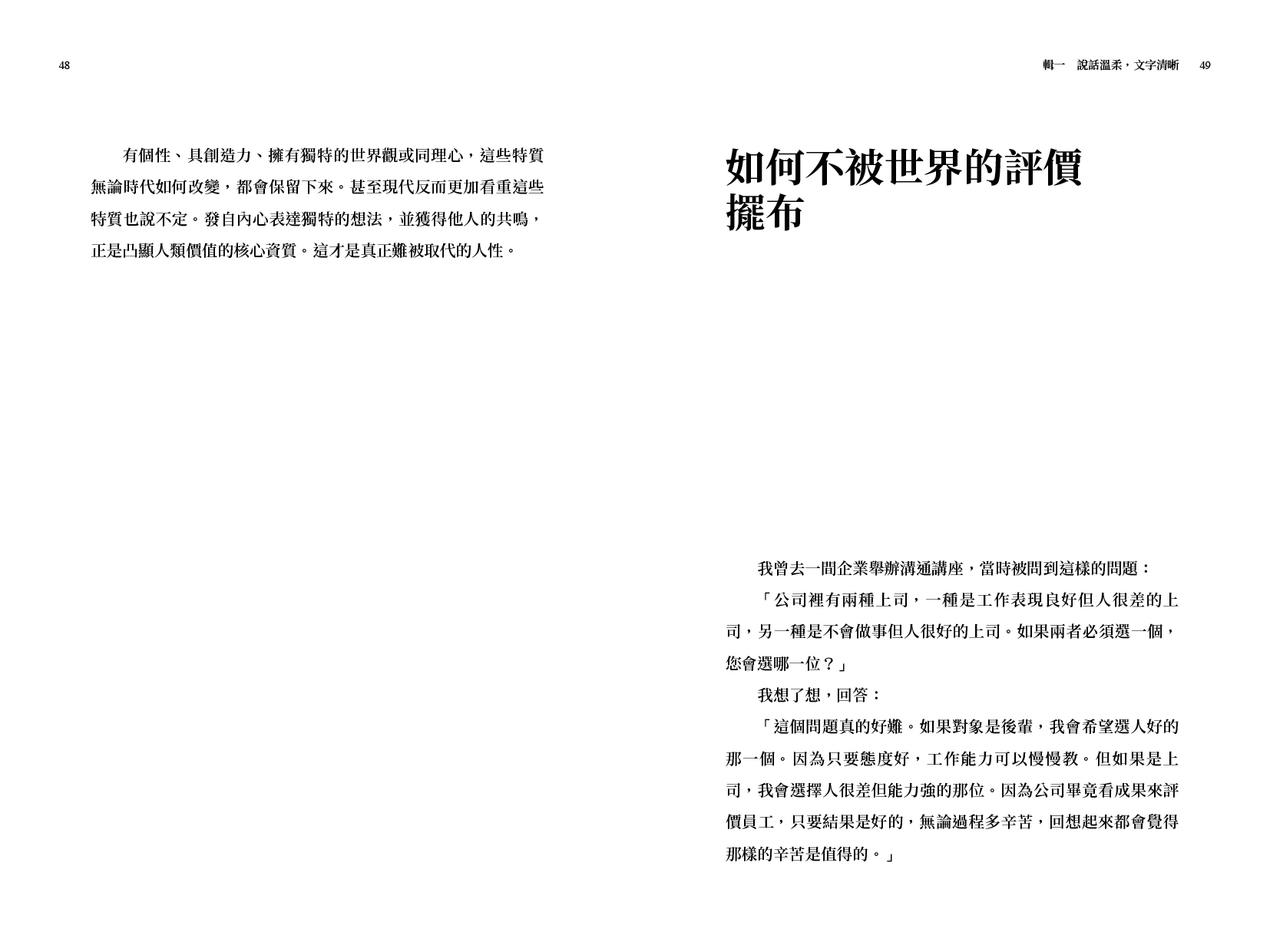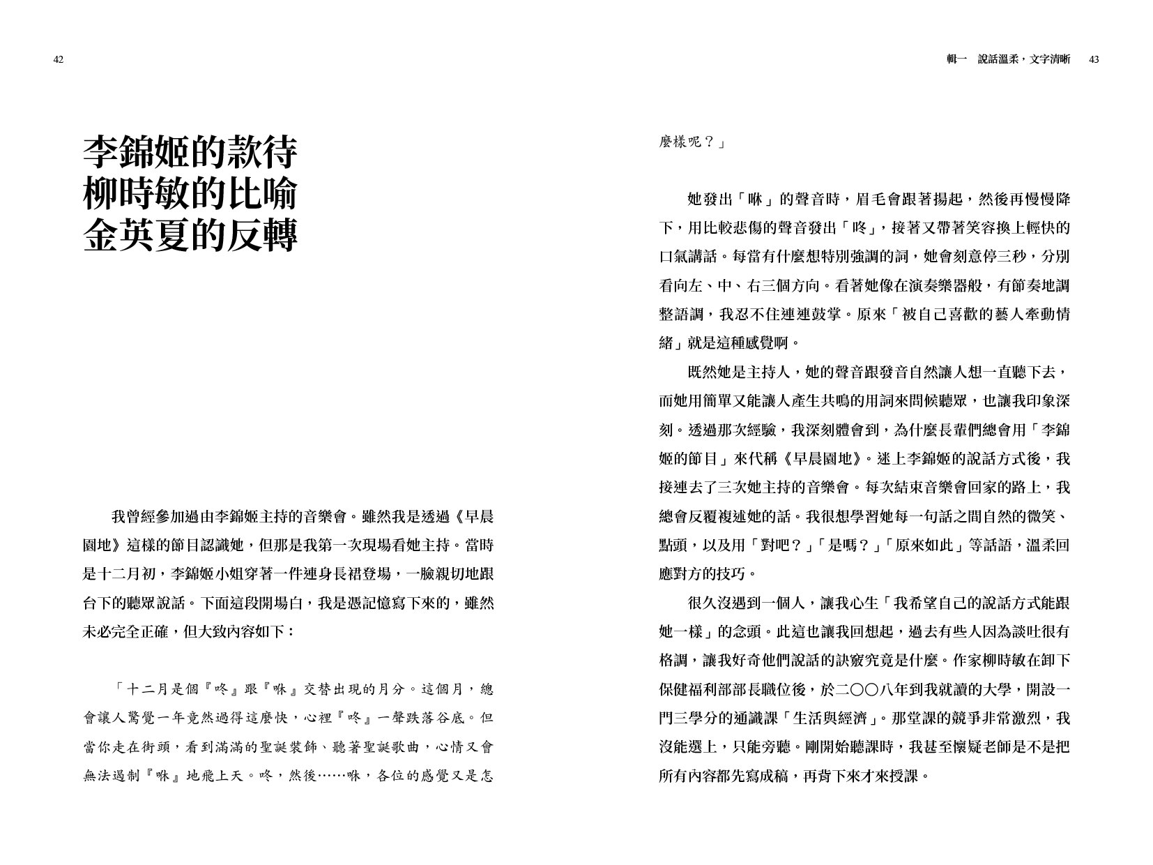 隨著越來越多人難以把話說好,也不擅長寫作和閱讀,能透過語言跟文字表達自我的人,未來將更有競爭力。如果你想把話說清楚,卻總是不小心說得太尖銳;如果你希望自己說話親切,卻總是無法把訊息傳達得明確;如果你覺得自己在說話跟寫作方面實在羞於見人,那我希望跟你分享一些我從經驗中得到的領悟。