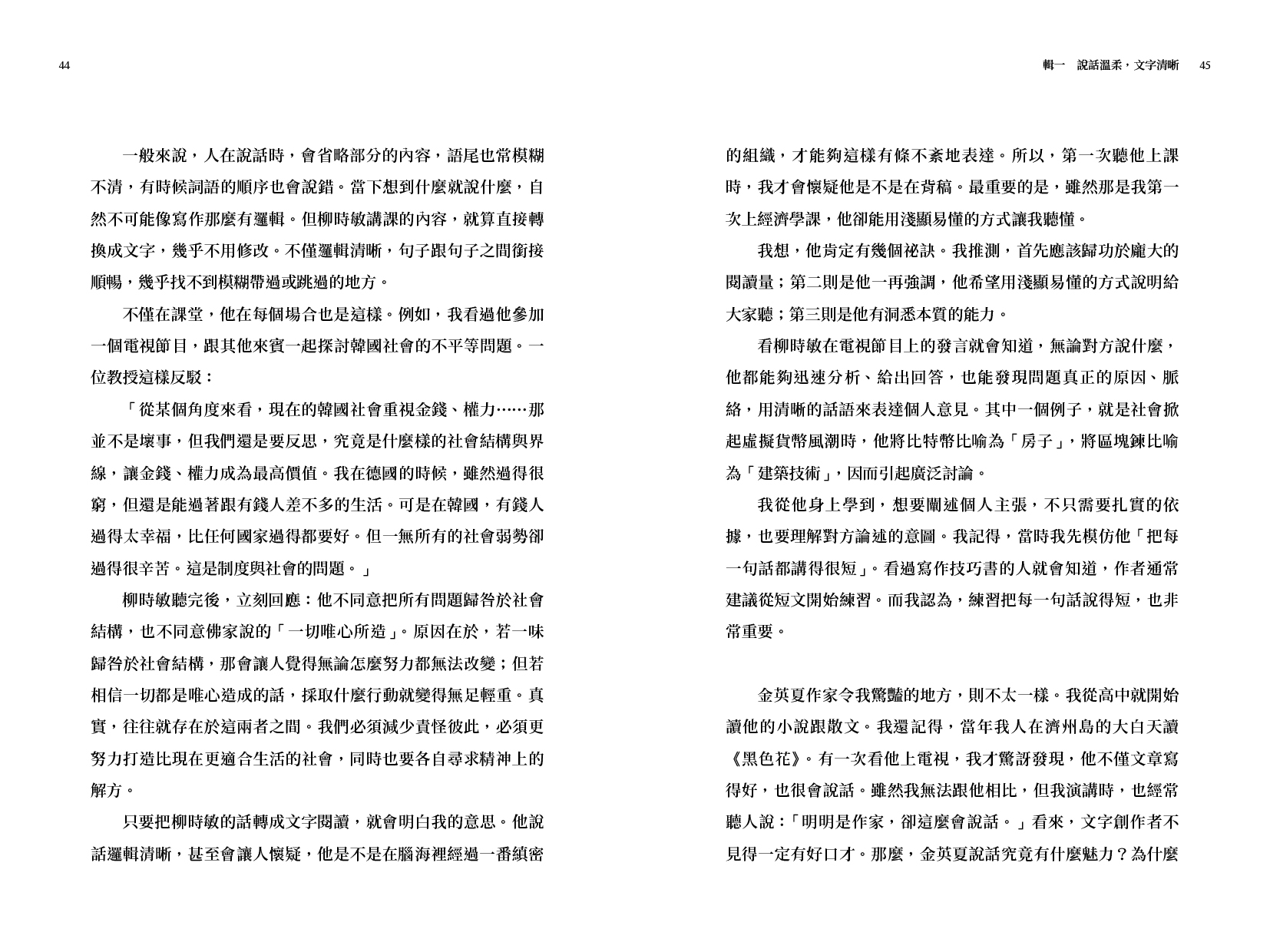 寫這本書時,我試著不去遵循這種寫作方式,但最後還是失敗了。無論我怎麼回想小時候的記憶,也依然想不起被稱讚口才好的經驗,而我也不是喜歡站在眾人前說話的人。不過,我從國中開始,就經常透過寫作獲得校內外的獎項,因此寫作方面還算有些信心。在我的記憶中,文字對我來說總是比說話來得自在。