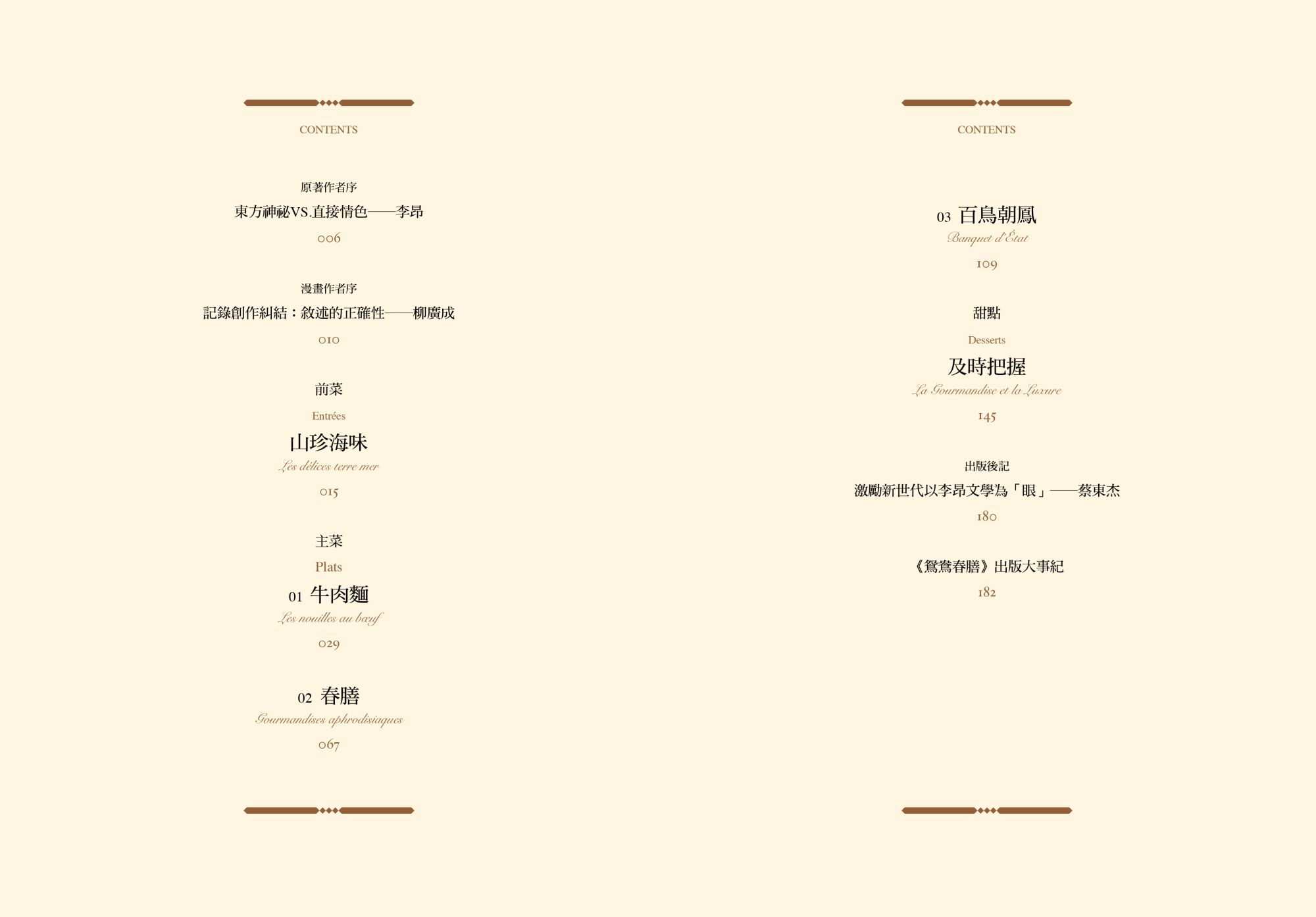 由作家李昂創作小說《鴛鴦春膳》(已授權法文版)為本,跨界合作香港漫畫作者柳廣成,以漫畫形式重新詮釋,將故事中飽滿的情色象徵、食物意象與對於性別、權力的深刻探討,以視覺藝術語言完美呈現。