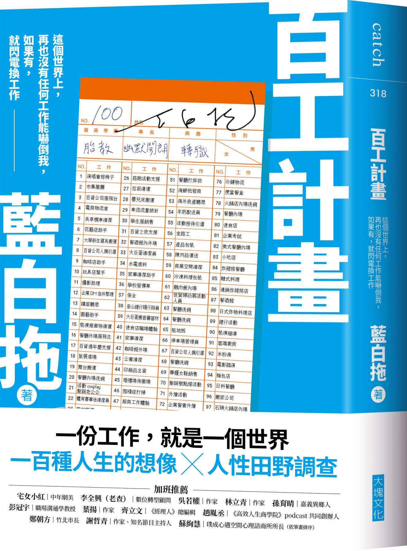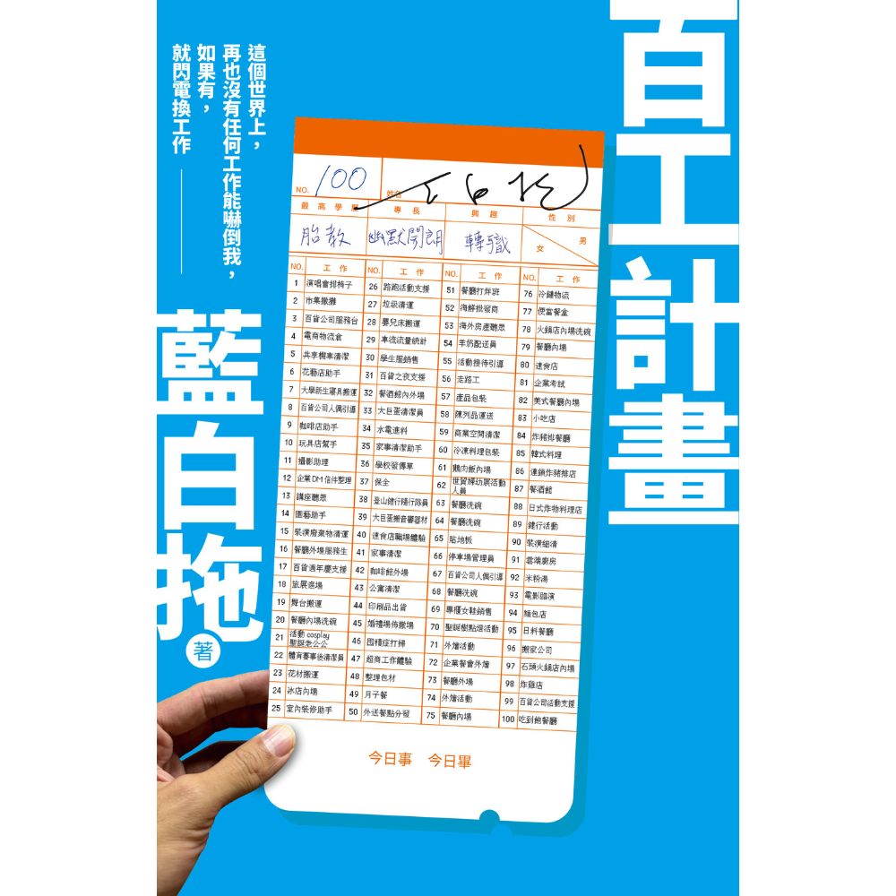 這是一個店家大缺工時代,也是派遣的黃金時代。而藍白拖的《百工計畫》,則濃縮了這個時代的職場所發生的一百種幽默、荒謬、勵志、悲傷與溫暖。這是他用行為藝術式的書寫,展開的一場奇妙「人性需求田野調查」,也可以激發你對人生的新想像!