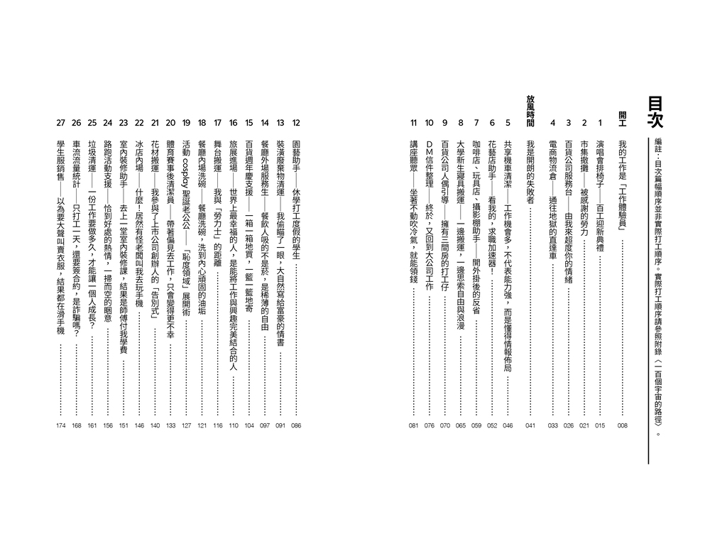 他花了二十四個月、換一百個工作,也遇到了各式各樣的人:一直找陌生人代班的奇才保全、要員工記得去滑手機的老闆、溫暖人心的臨時演員、工作到原地昏倒的同事、買下三間房的百貨人偶⋯⋯
