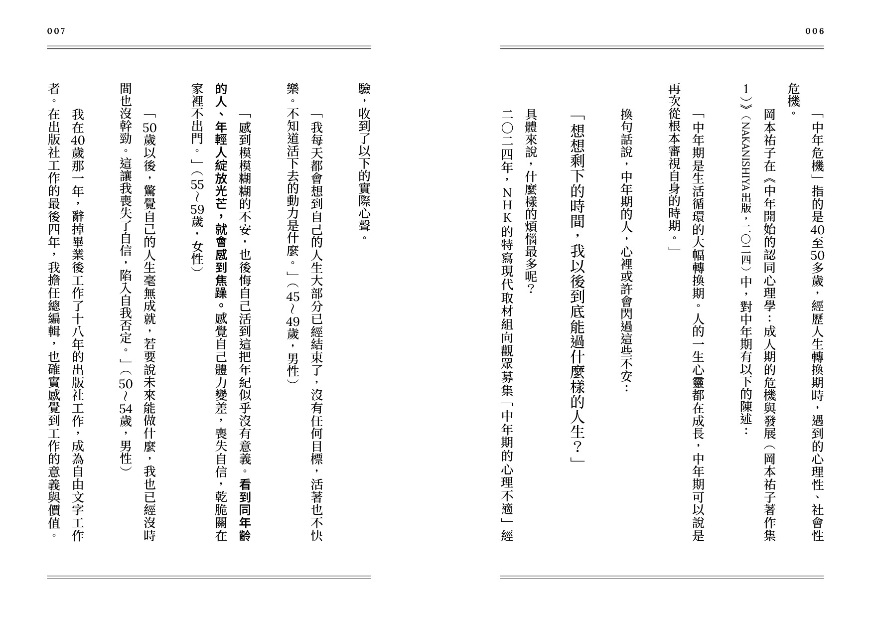 岡本祐子在《中年開始的認同心理學:成人期的危機與發展(岡本祐子著作集)》(NAKANISHIYA 出版,二○二四)中,對中年期有以下的陳述: