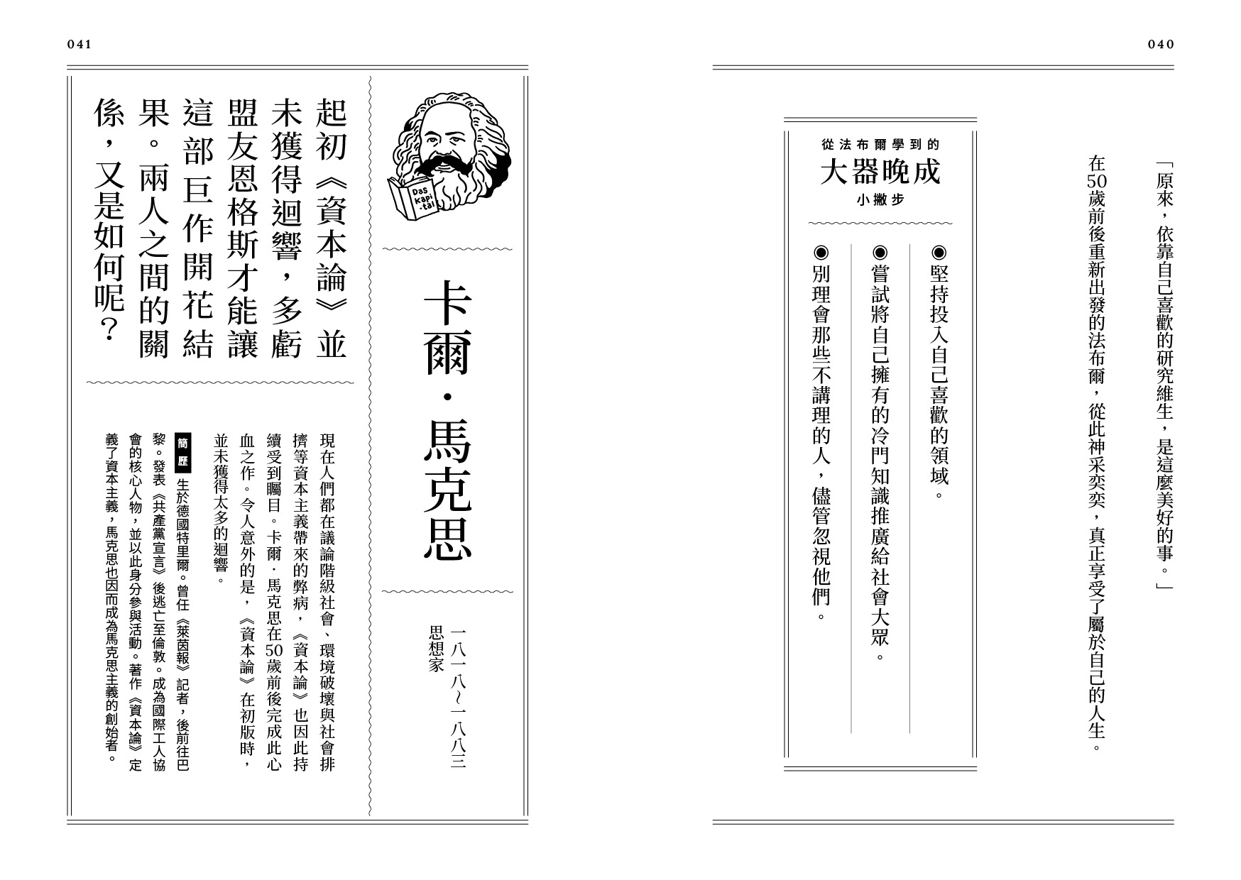 本書著重於介紹「大器晚成型」偉人的中年期。現代有許多人到了中年期,紛紛面臨「中年危機」,偉人們又是怎麼度過這個難關的呢?