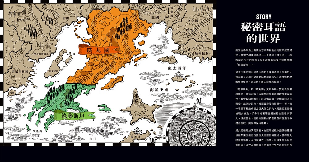 文字部分委由資深動漫專家張清龍根據怪獸樣貌編寫系譜和發人深省的設定,建構出一整個有著80隻獨一無二的全新怪獸星球生態系和物種,開啟另一個無邊無際的奇想宇宙。 一條由汙染毒物及血肉匯聚成的河流,貫穿了相連的兩國——上游的「鐵丸國」,亦即《秘密耳語》主角秘密所在的國家;和下游擁有諸多生化怪獸的「綠藤斯坦」。