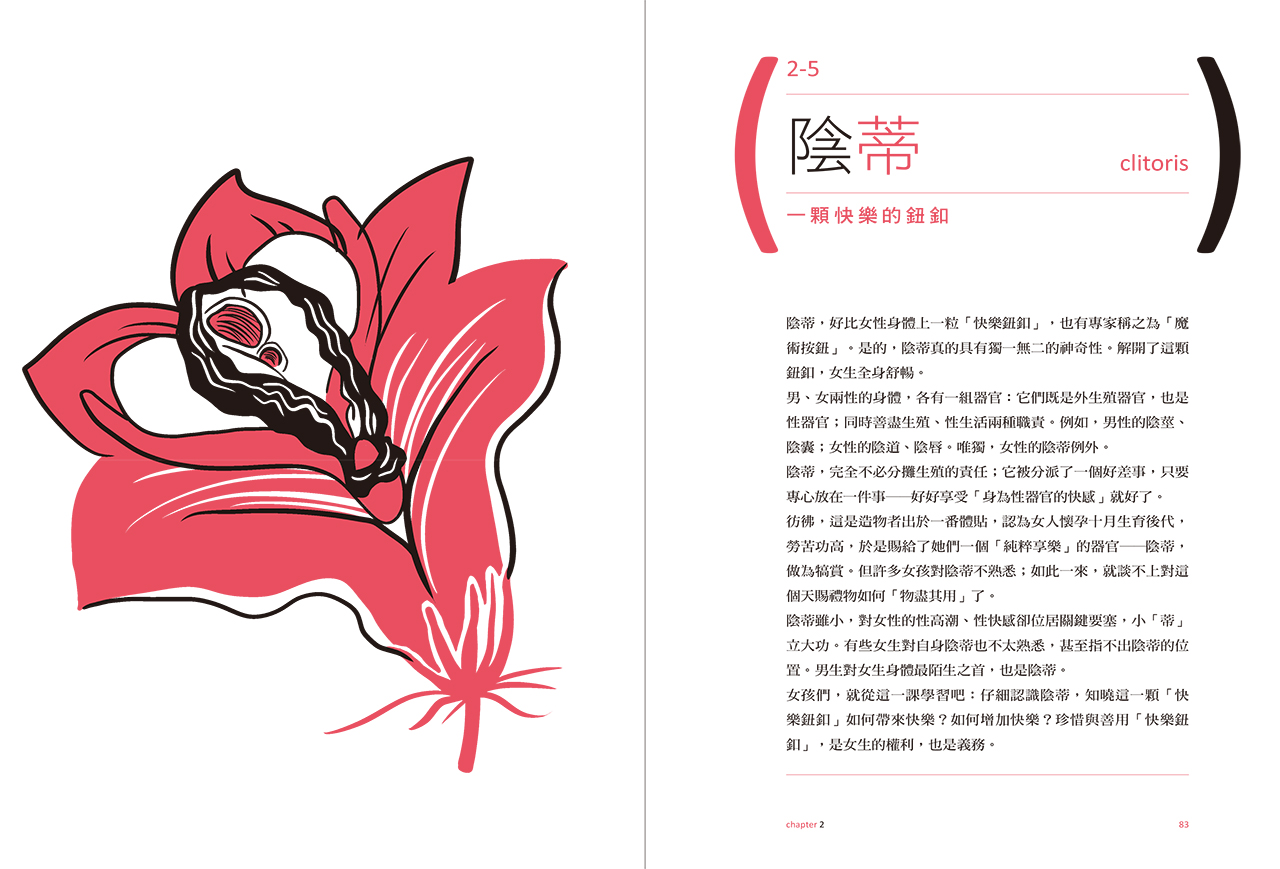 在我們的日常生活文化及教育裡,很鼓勵男孩們發展情慾、探索自我,對於女孩卻反對去認識自己的身體、去喜歡自己的身體、性及慾望。就拿「自慰」這件事來說,在男孩身上是健康的、可喜的,在女孩身上卻是難以啟齒的、羞恥的、不應該的、可畏懼的。對於「滿足自己的歡愉喜悅」這件事,都不這麼被允許,就更遑論要培養出女性獨立自主的自信心了。所以當大辣出版找我畫這組插畫時,他們的想法是把女人的生殖器官看作花朵,我非常喜歡這個概念「男人是草、是樹,女人是花朵」。讓兩性都喜悅於自己的存在,都能愛自己的生理構造以及天生的生物反應與慾望,這是我在創作時,暗自寄予的期待。