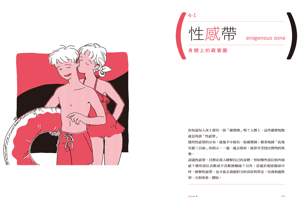 「接觸到這次的案子,想起以前慢慢從各個地方,拼湊出對性完整印象的過程,那種對未知事物探索的罪惡感,想想是這個環境老是避重就輕的談論性與戀愛關係,所以在繪製幾幅配圖時,盡量表現出親近柔軟的味道,希望讀者能透過這本書讓發現自己身上的小天地。」