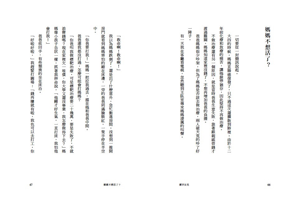 媽媽,那些我在五歲、六歲、十歲、十五歲、十七歲時流著淚睡去的夜晚,那些嘶吼與冷戰,那些毒打、逼迫我學習的時刻,可不會輕易成了過眼雲煙。