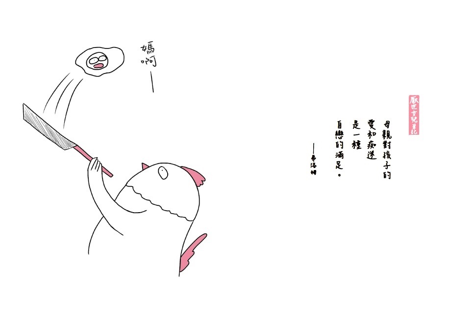 讀到有點心痛的話,請按照插圖做各種蛋料理,就算厭世姬把媽媽吃掉孩子的惡趣味發揮到極致,她畫的食物看起來還是相當好吃。各種美味平和的殺人現場,太好的比喻。你夠好了,好到不能再好,書值得大賣,苦難折成現金,一切還是有意義的。