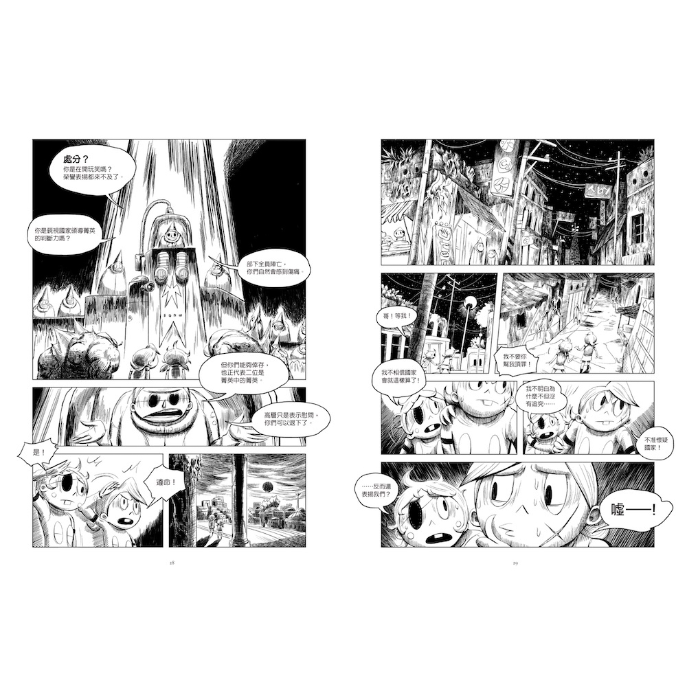 「童趣畫風包裝著的殘酷奇想漫畫,第二集,兩國的恩怨秘密逐漸揭露!敵國就是敵人?不!最大的敵人是還不夠『愛國』的人!愛國很簡單!只要無視滿街的屍體,生活如常,偶爾搶個怪獸肉回家吃就可以啦!輕鬆!」——紙本分格|香港漫畫推廣團體