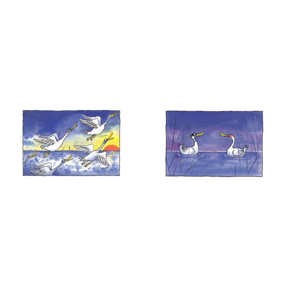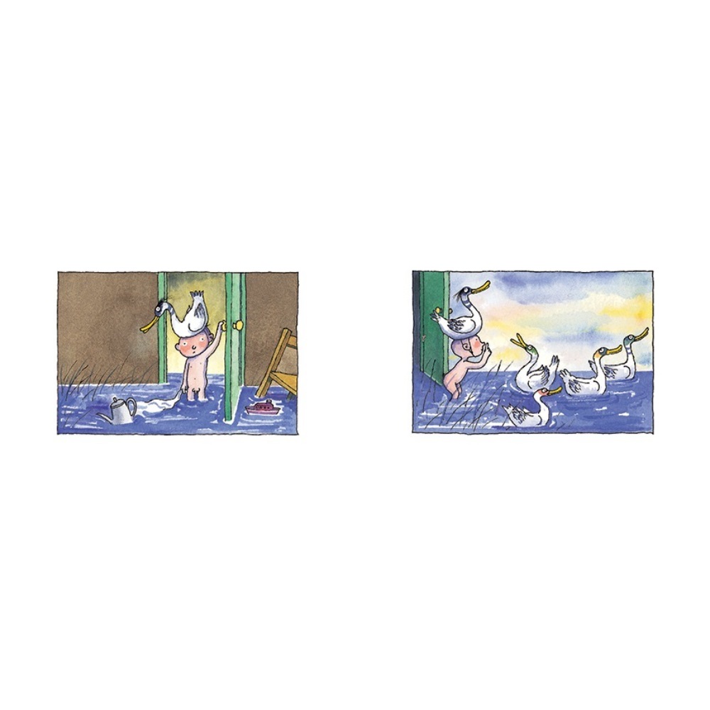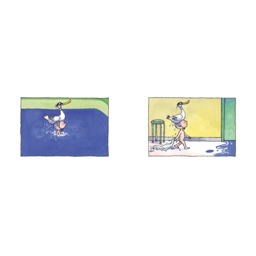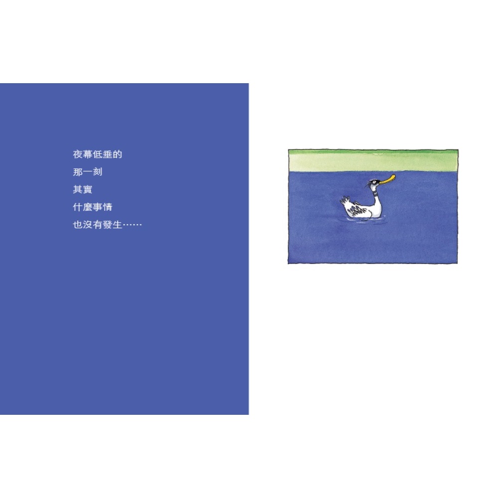 然後是一隻小豬的可愛端正,這又開始令人像吸食鴉片般陷溺:「肚子餓了 開始吃飯」→「吃得飽飽 開始想你」→「覺得睏了 開始睡覺」→「睜開眼睛 開始想你」這隻小豬的深情告白讓屬於一本書的情緒完全展露,接下來的文字就像仙女的魔法棒,點到哪裡哪裡就發光發亮,書中很多神來之筆,像有一篇題為「剛好」的短篇,17幅圖文巧妙地搭配,剛剛好,不多也不少。