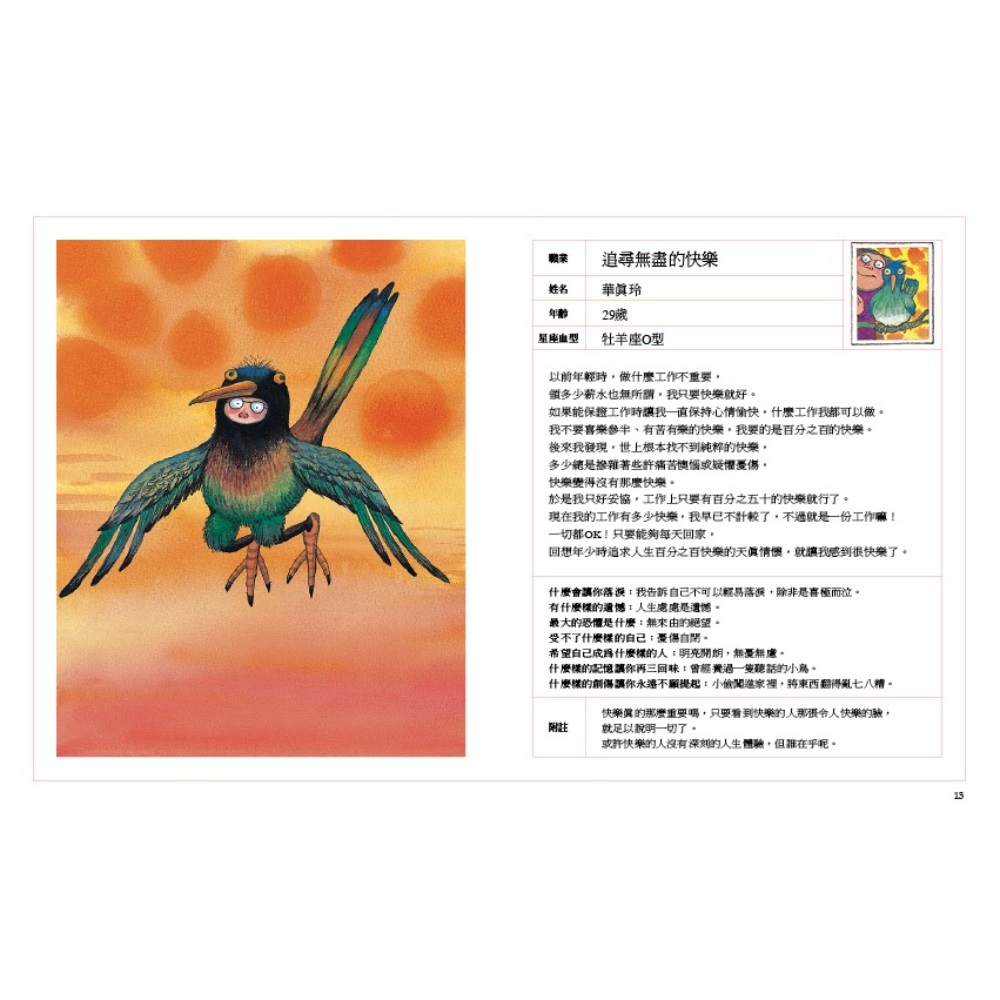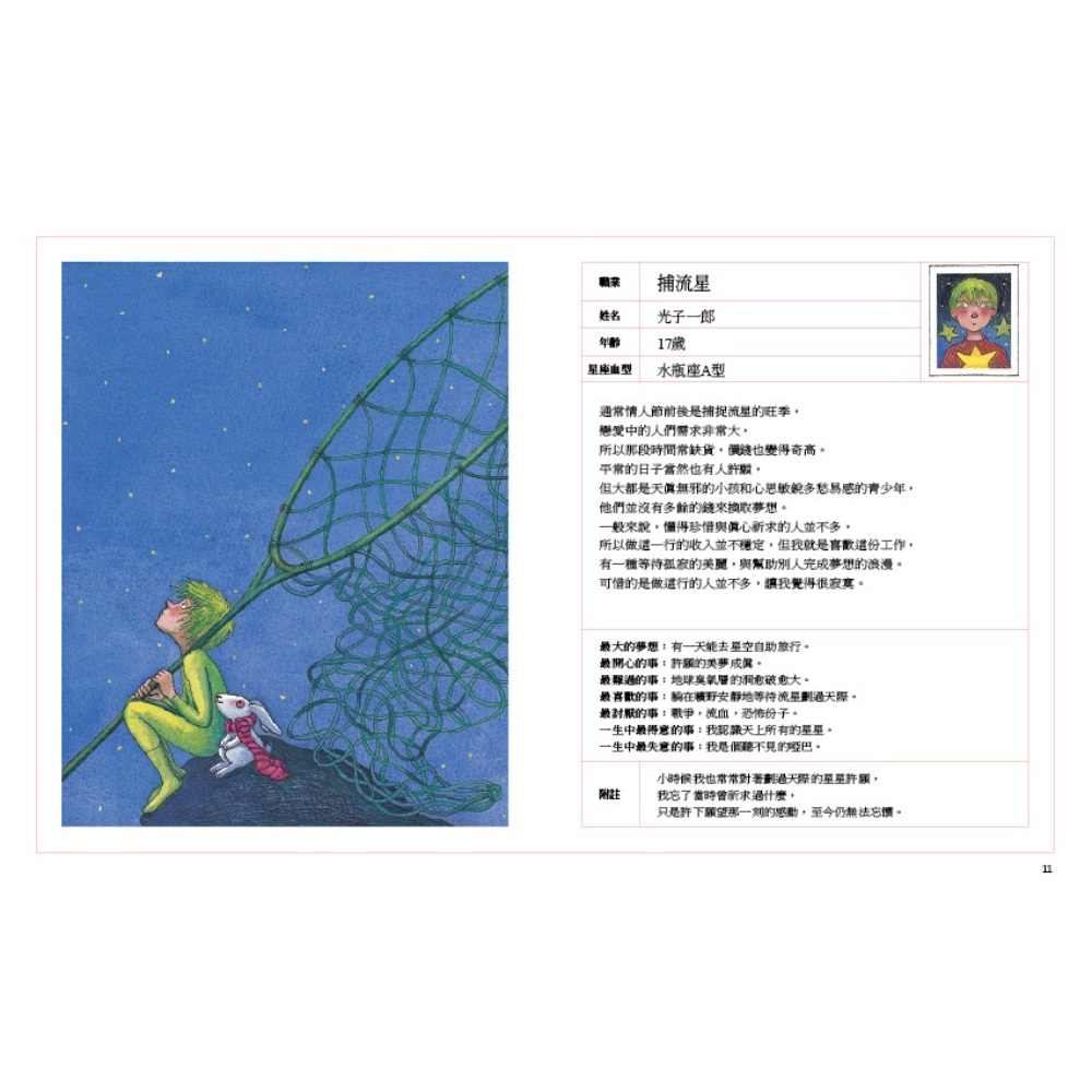 幾米說:「當我閱讀人物專訪時,最吸引我的部分,不見得是採訪的內容,而是人物小檔案,看著上面列出的姓名、學歷、經歷,甚至是星座、血型、工作等等,反而讓我覺得很有意思。我很喜歡想像他人的生活。因此,我靈機一動,想要以履歷的方式,介紹各形各色的工作。 「書裡的發想來自於當下的生活經驗。比方說,有一陣子,女兒常吵著要我帶她去水族館,參觀後,我就畫了一篇〈表演餵魚〉。