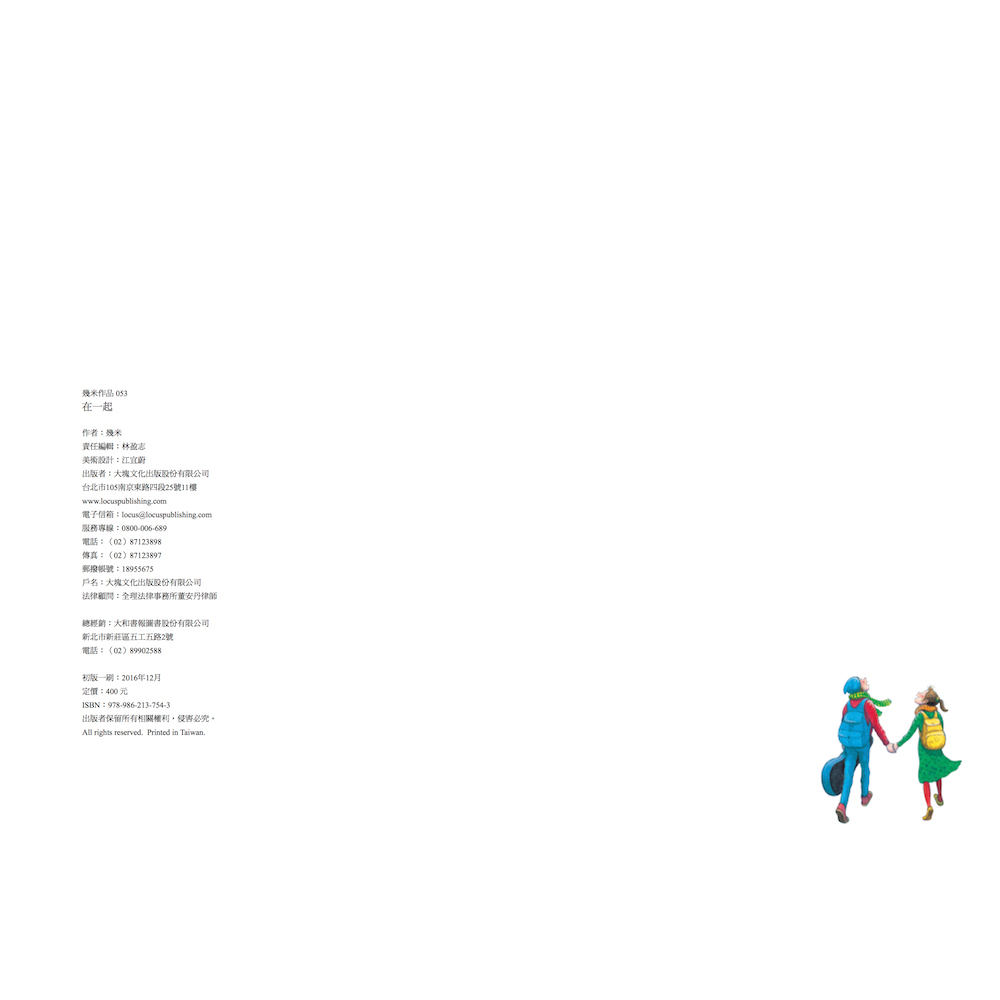 《在一起》是脫胎自幾米《忽遠忽近》畫作的筆記書,特別收錄未放進繪本中的畫作,呈現兩位主角甜蜜在一起的氛圍,是有別於繪本故事的另一種版本。全書硬殼裸背裝訂,便於攤平書寫也方便攜帶收藏。書前有萬用月曆和週曆,可以自行依照個人需求安排時程。