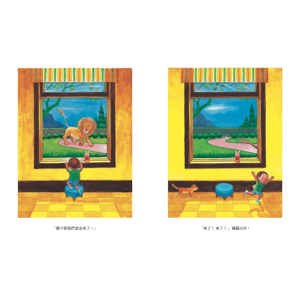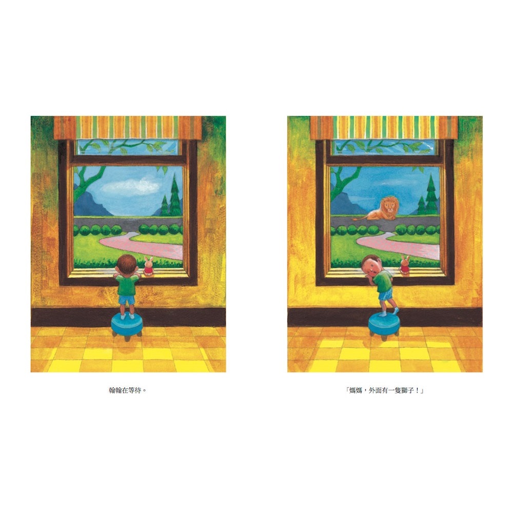 翰翰在窗邊等待,像是在期待誰到家裡來。 翰翰看到獅子向家裡走來,翰翰開門讓獅子進來,幫牠把腳上的鐵釘拔掉,溫柔地替牠包紮,獅子感謝翰翰。 之後大象以及鶴都陸續來找翰翰,希望翰翰幫牠們的傷口包紮。 但翰翰還是很緊張、很期待地在窗前等候,他在等很久不見的爸爸回來⋯⋯