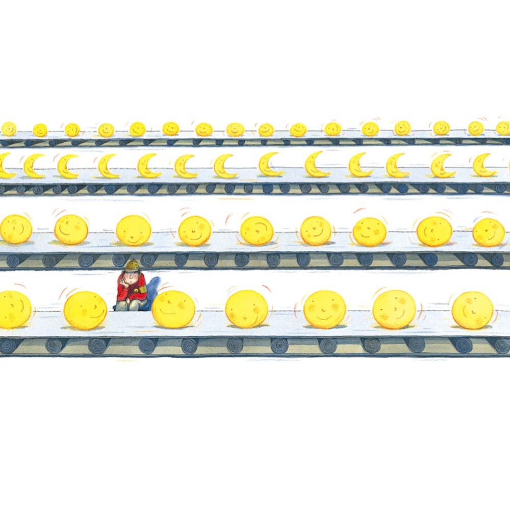 畫中所有的角色全都籠罩在黑暗之中,而他們所注視的,其實是月亮的倒影,彷彿是各自心中想法或渴望的投射。當這些幻想類童書繪本的角色有了思想與渴望,他們就有了生命與人性,畫面則因此成為情境,而有了故事。