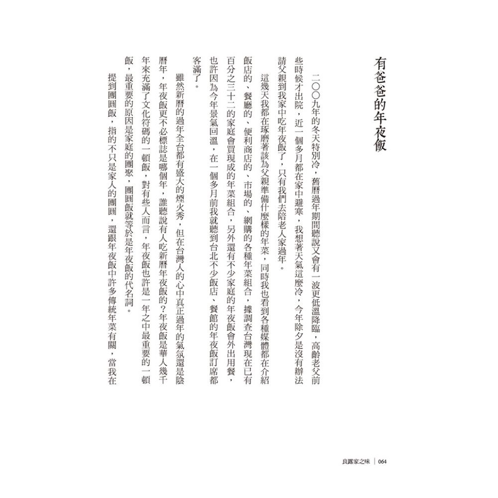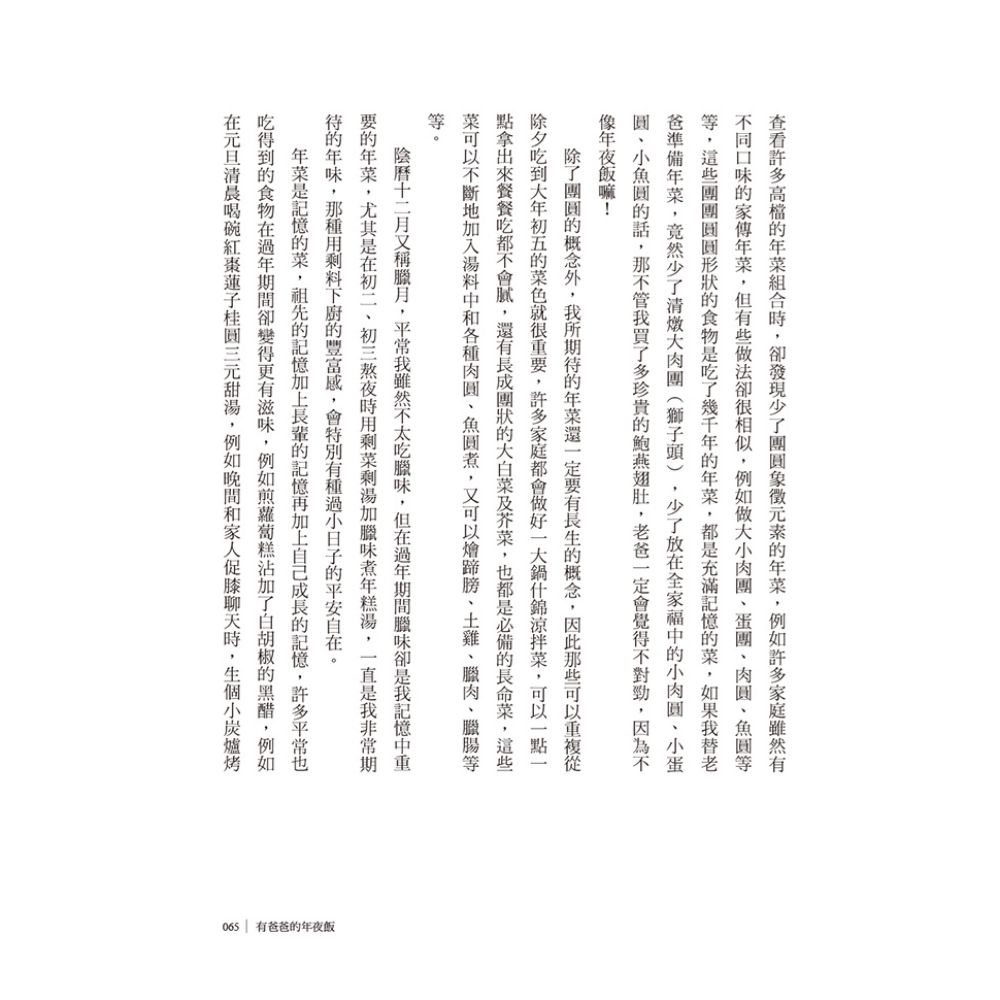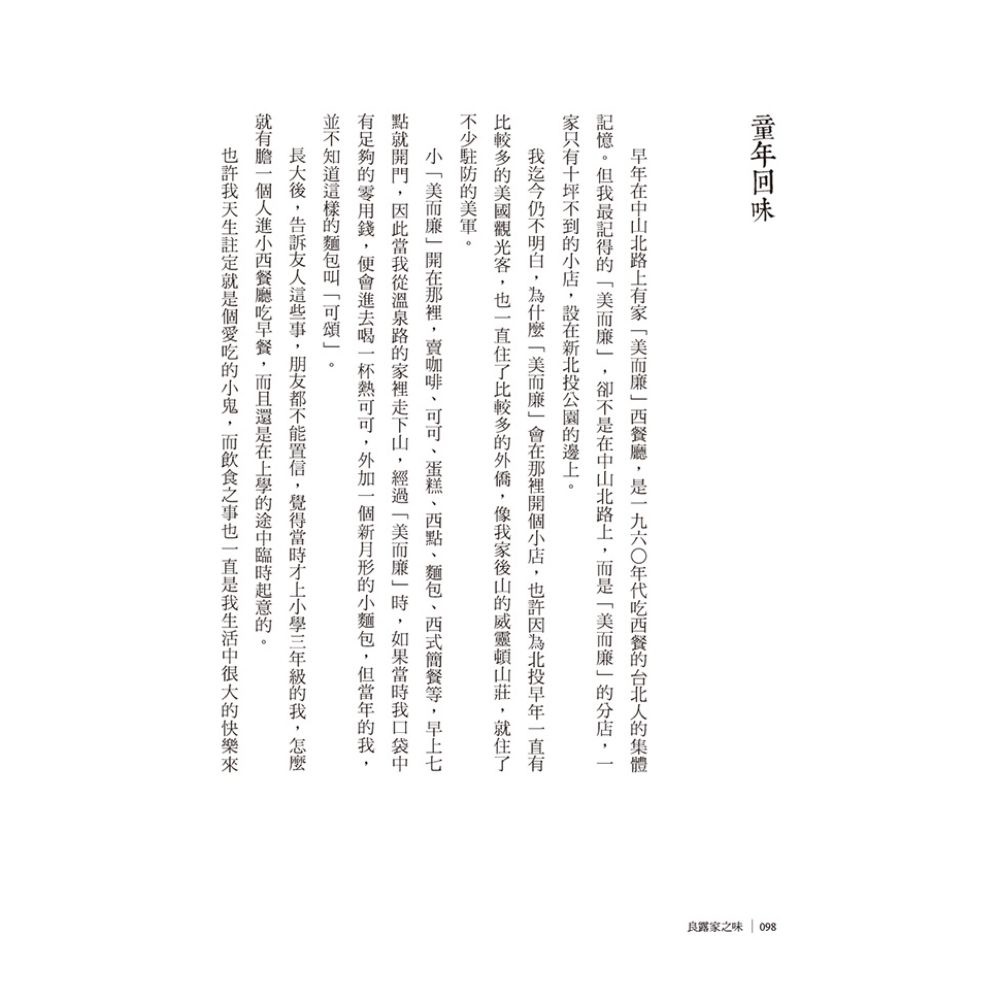 生命歷經歲月的淘洗,身旁的人事物大都隨著時間流逝或變調了,但味覺卻承載著記憶,調和人生的美好與苦澀。每個人都有屬於自己的美食地圖和懷念的味道;韓良露回溯記憶中的家之味,重溫人生的幸福時光,不禁讓人回首凝視,屬於自己的美味人生。